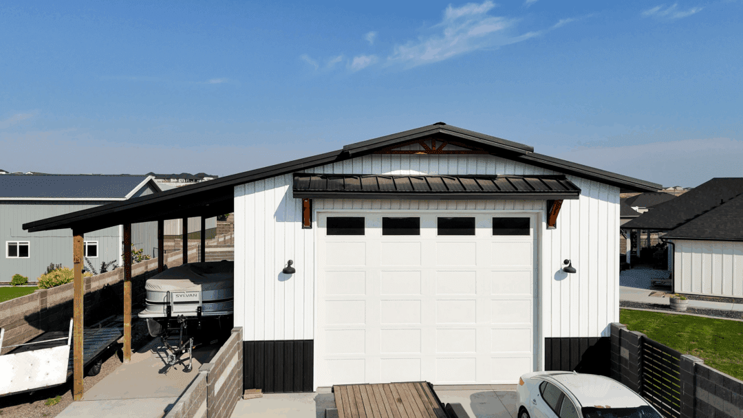 Steel Structures America built this 30′ × 40′ × 16′ post-frame shop in Pasco, WA. With an attached lean-to, large overhead doors, and detailed gable accents, this project balances storage, utility, and curb appeal.