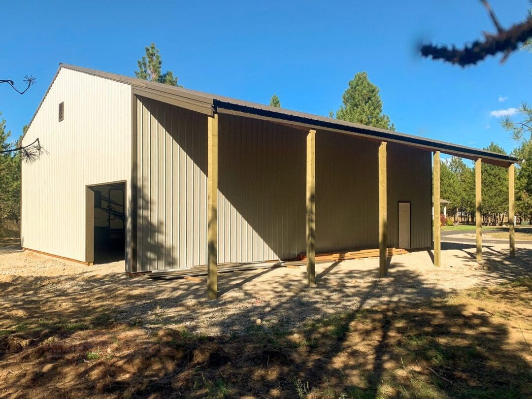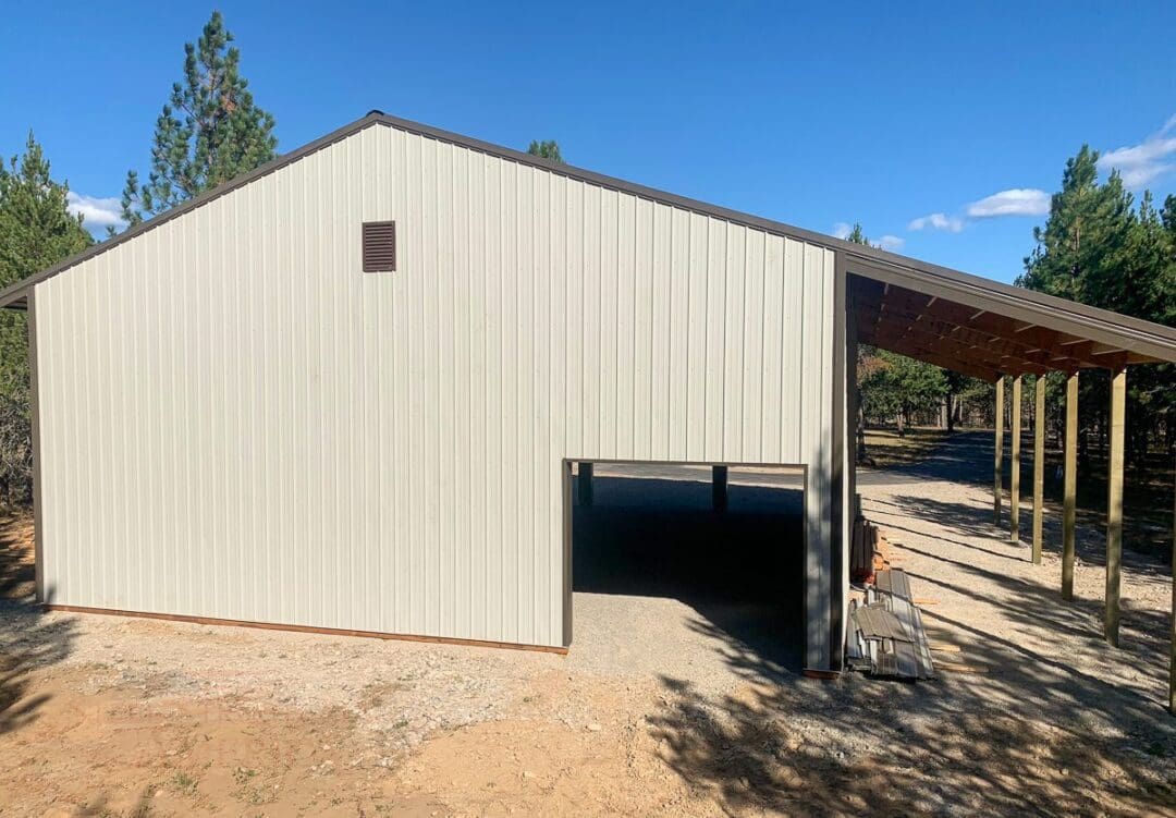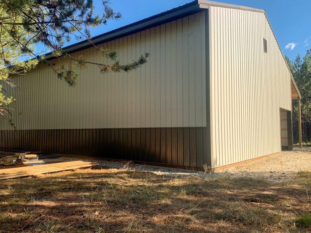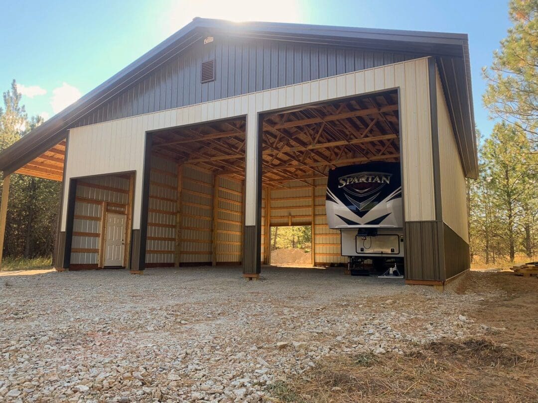 Very functional 40x50x16 w/12x50x11 lean-to. (2) Large RV Boat doors and additional vehicle or smaller overhead doors for the toys. 2′ overhangs, 4′ wainscot, this is a great multi-functional building.