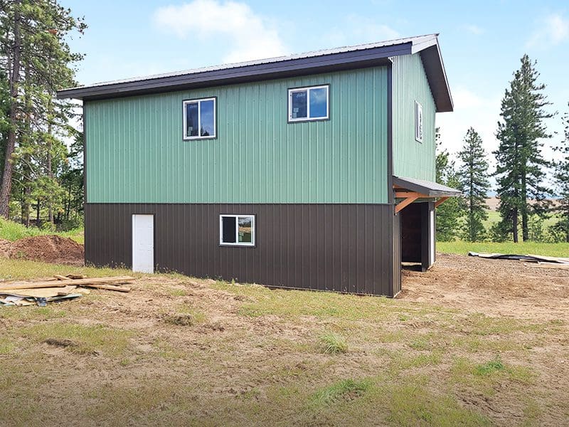 25′ x 36′ x 20′ 2 Story Shop in Goldendale, Washington. Featuring 16′ x 8′ overhead garage door and 3′ canopy in sage green with weathered copper trim.