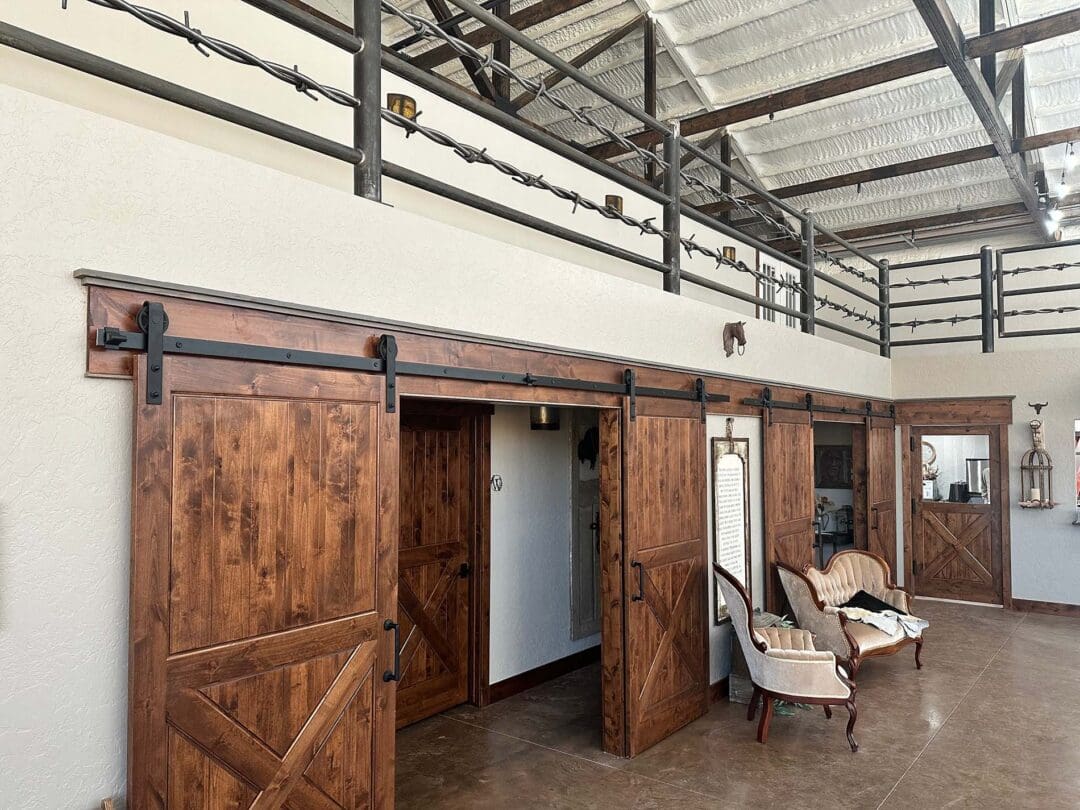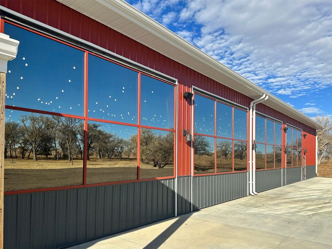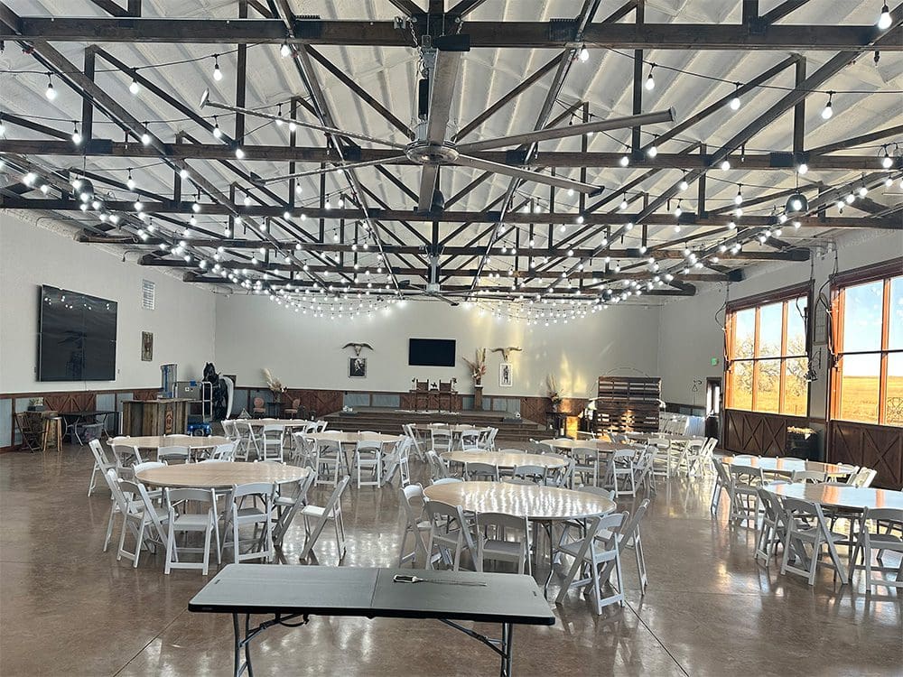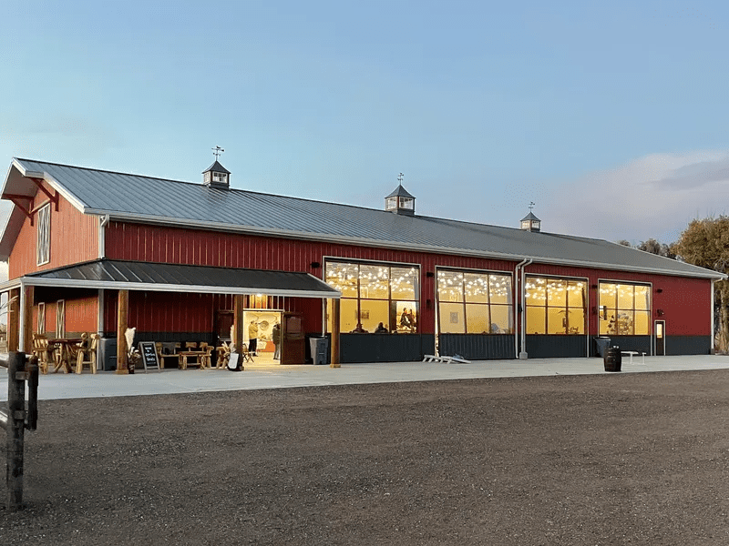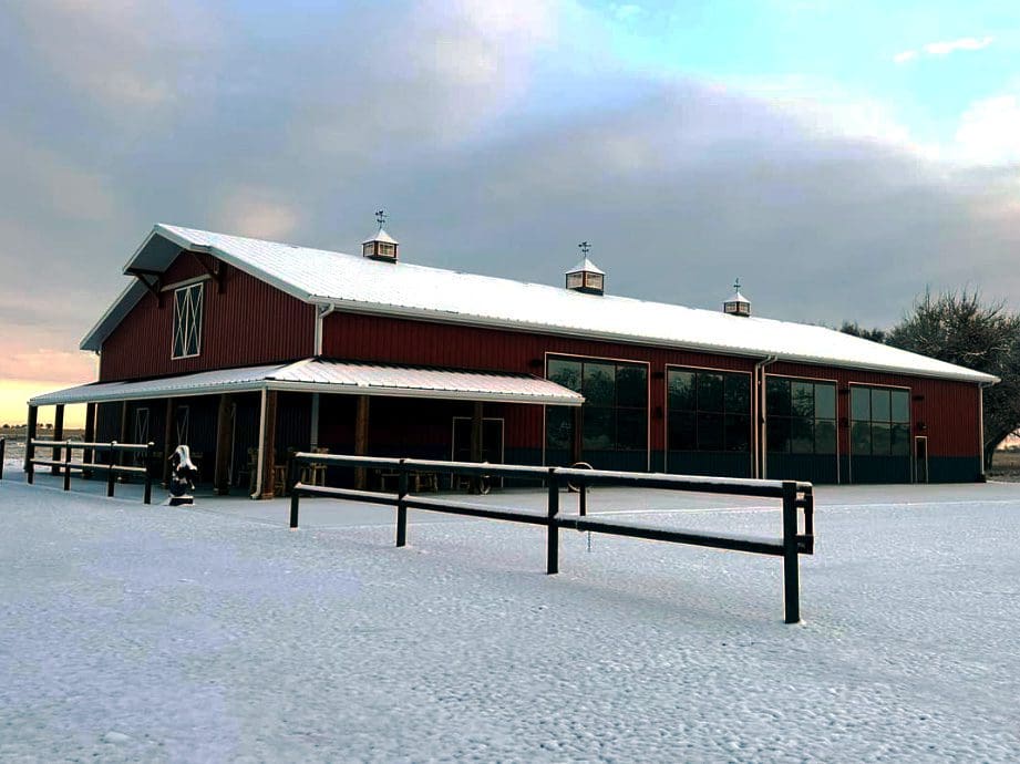 This beautiful modern multi-purpose event space in Briggsdale, Colorado, is a 60′ x 120′ x 16′ gable with an 8′ x 100′ x 8′ lean-to completed in rustic red with a charcoal roof and white trim. It features one 48″ cupola and two 36″ weathervane cupolas. Steel Structures America’s Colorado team specializes in the engineering and construction of post-frame steel buildings in Wyoming and Colorado.