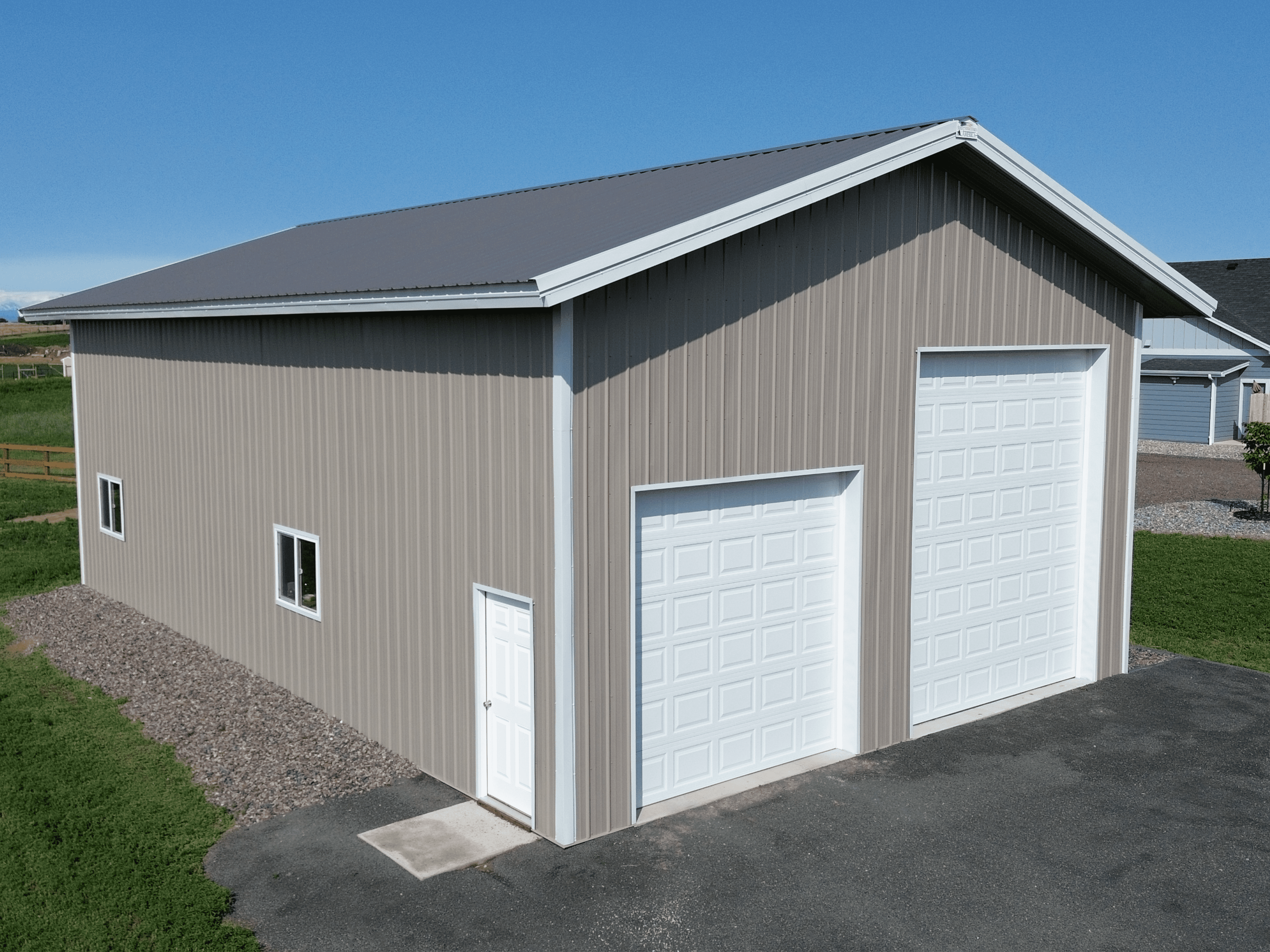 30′ x 48′ x 16′ garage featuring (1) 12′ x 14′ and (1) 10′ x 10′ overhead doors, single man door, (2) 4’x3′ double pane vinyl windows and 24″ overhangs in hickory moss siding with white trim accents.