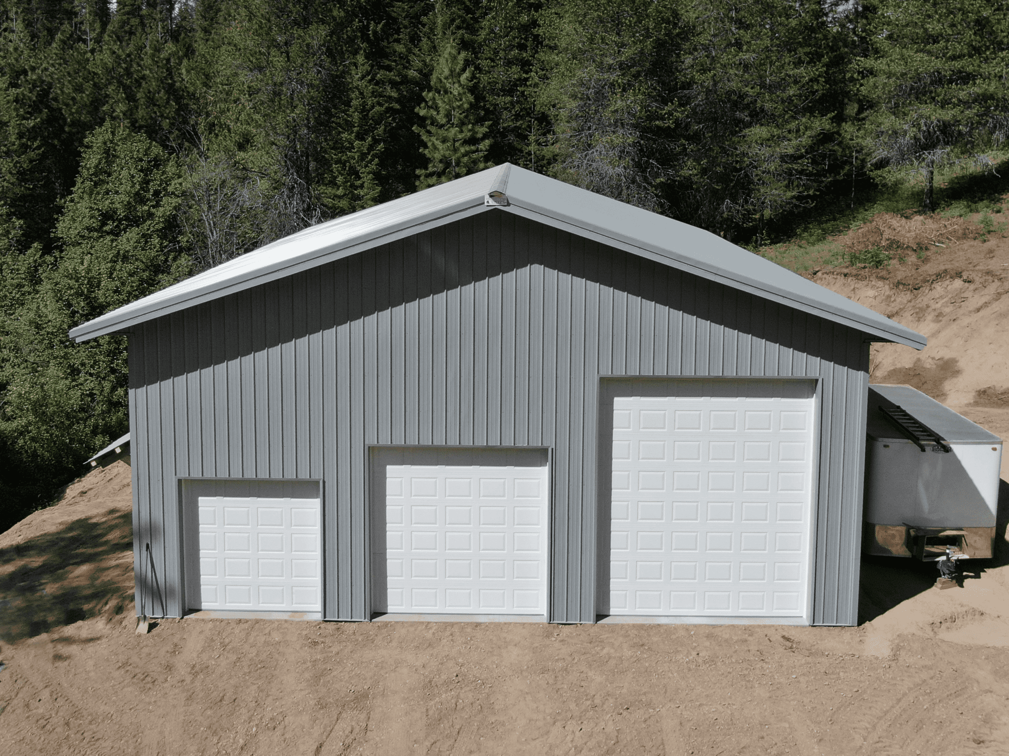 40′ x 60′ x 16′ garage featuring 12′ x 14′, 8′ x 8′ and 10′ x 10′ overhead doors, single man door and 24″ overhangs in surf siding and grey accent trim.