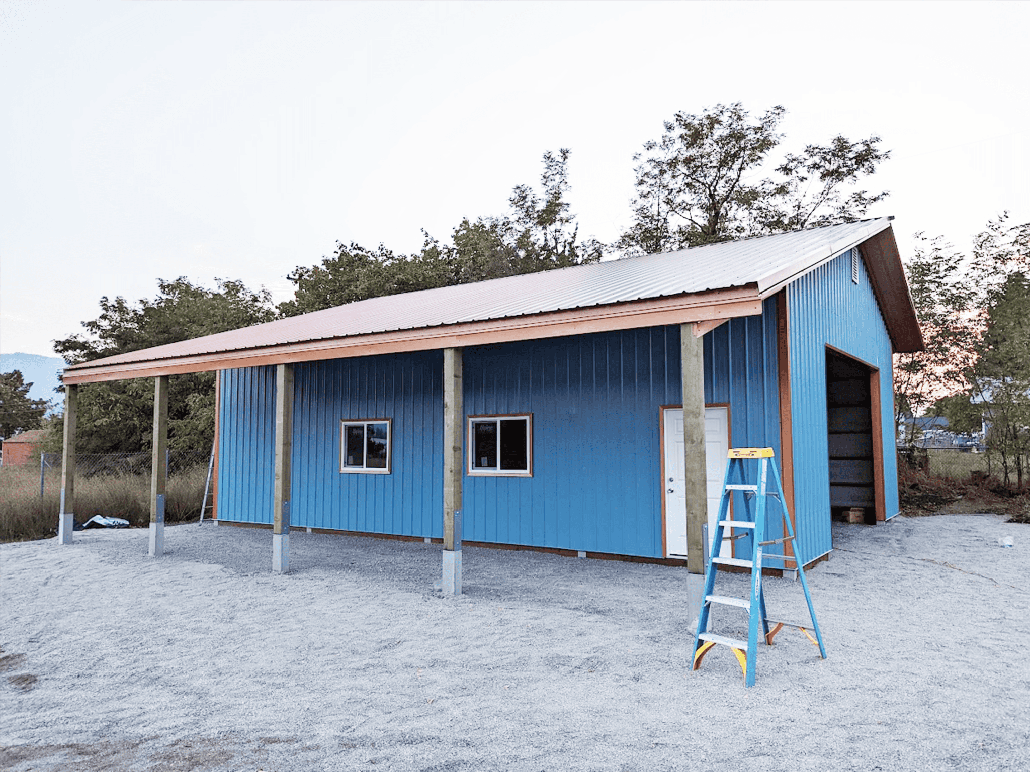 30′ x 40′ x 12′ single overhead door garage with 10′ x 40′ open lean to, (1) 16′ x 10′ Thema-Tech overhead door, (2) 4′ x 3′ windows with light blue siding and copper roof and accent trim.