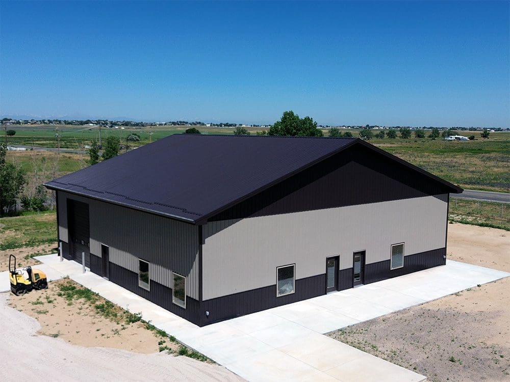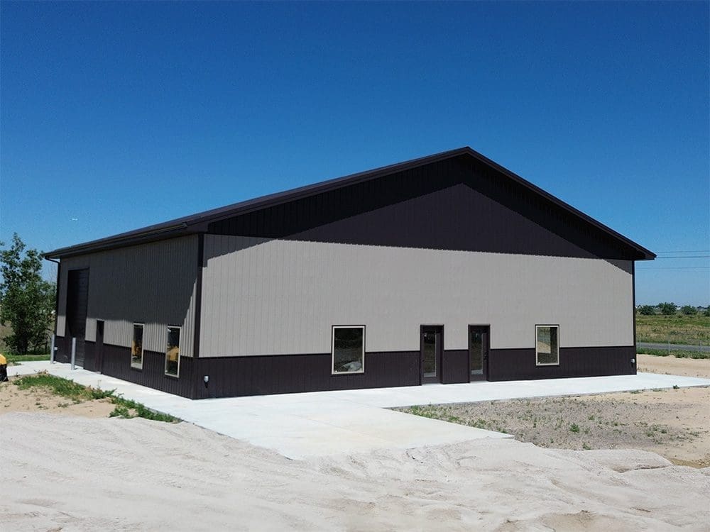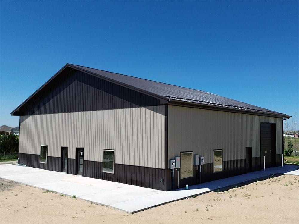 64′ x 60′ x 16′ shop featuring (2) 12′ x 14′ overhead doors, (4) man doors, (6) 4′ x 3′ vinyl windows and 24″ overhang.