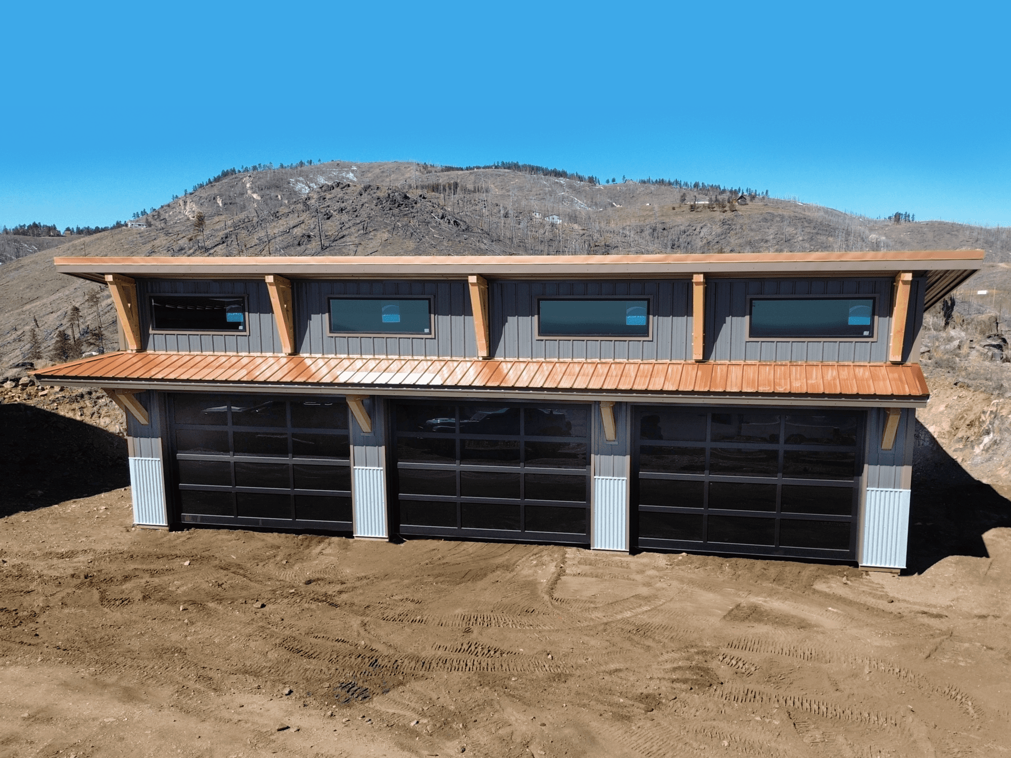 26′ x 36′ x 10′ mono slope garage featuring (3) 10′ x 8′ glass overhead doors, 24″ overhangs, 4′ wainscot in Desert Brown and siding Charcoal with Copper Penny accents.