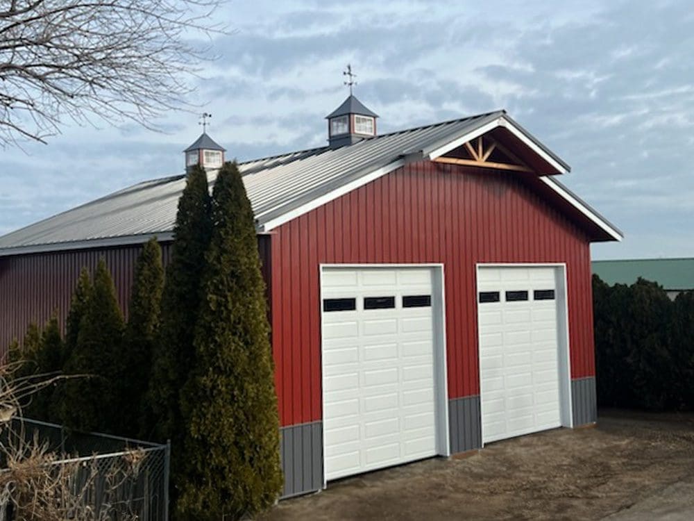 36′ x 48′ x 16′ garage with 10′ x 36′ lean-to featuring (2) 12′ x 14′ and (1) 12′ x 8′ overhead doors, 24″ overhangs, 4′ wainscot, 16′ extended gable with timber truss and (2) 36″ cupolas with weathervanes.