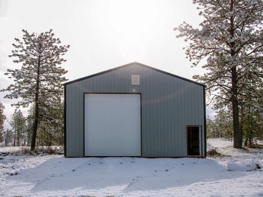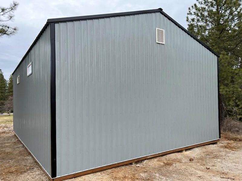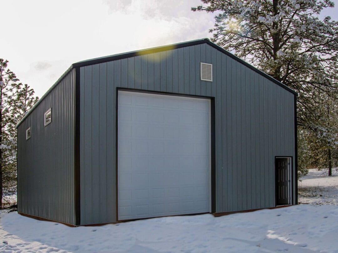 This custom 30′ x 40′ x 16′ small garage was completed with a weathered copper body and black roof and accents. This residential garage features one 12′ x 14′ overhead steel garage door.