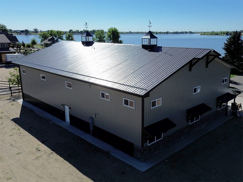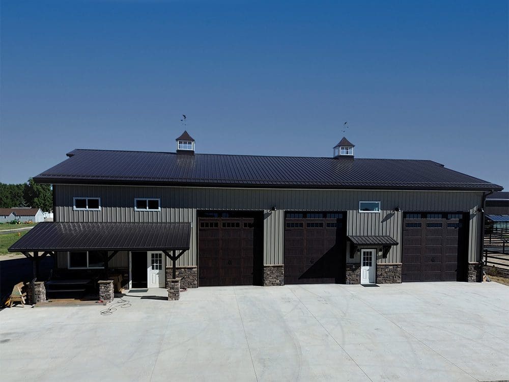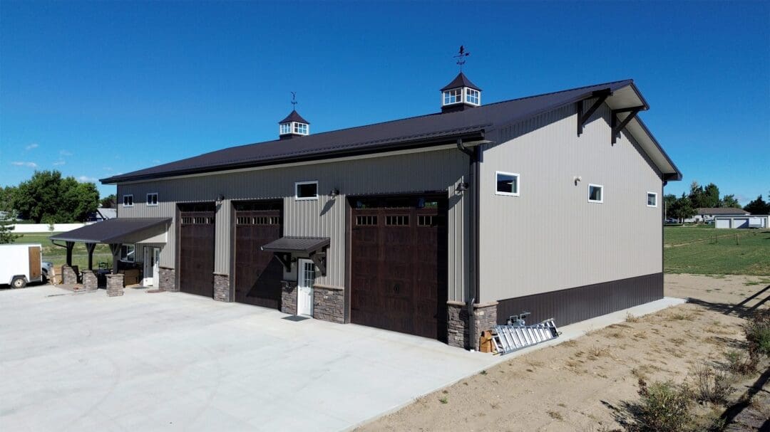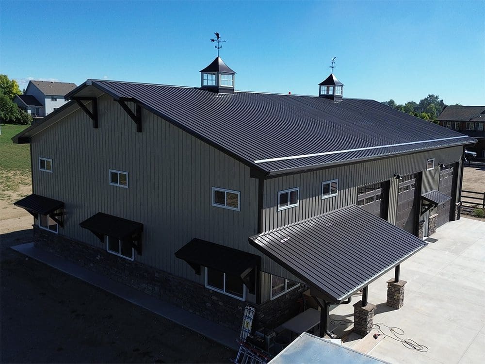 This pole barn shop is 50′ x 80′ x 18′. It features 8′ x 24′ 12′ open lean-to, (2) 12′ x 14′ and (1) 14′ x 14′ overhead garage doors, (4) eyebrows with corbels, (2) 48″ cupolas with eagles, (2) 12′ x 3′ gable extensions, (17) windows, 4′ stone wainscot with light stone siding and dark brown accent trim. Steel Structures America team in Colorado can transform your pole barn shop ideas into reality. Give us a call today, to find out how easy it is to get a pole barn metal shop building.