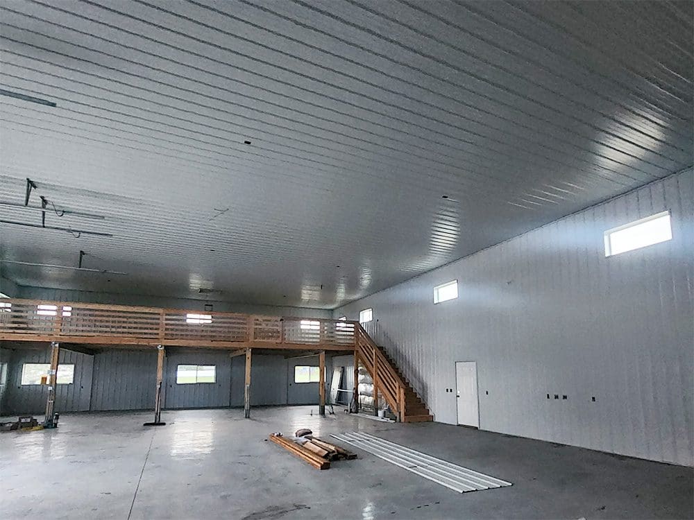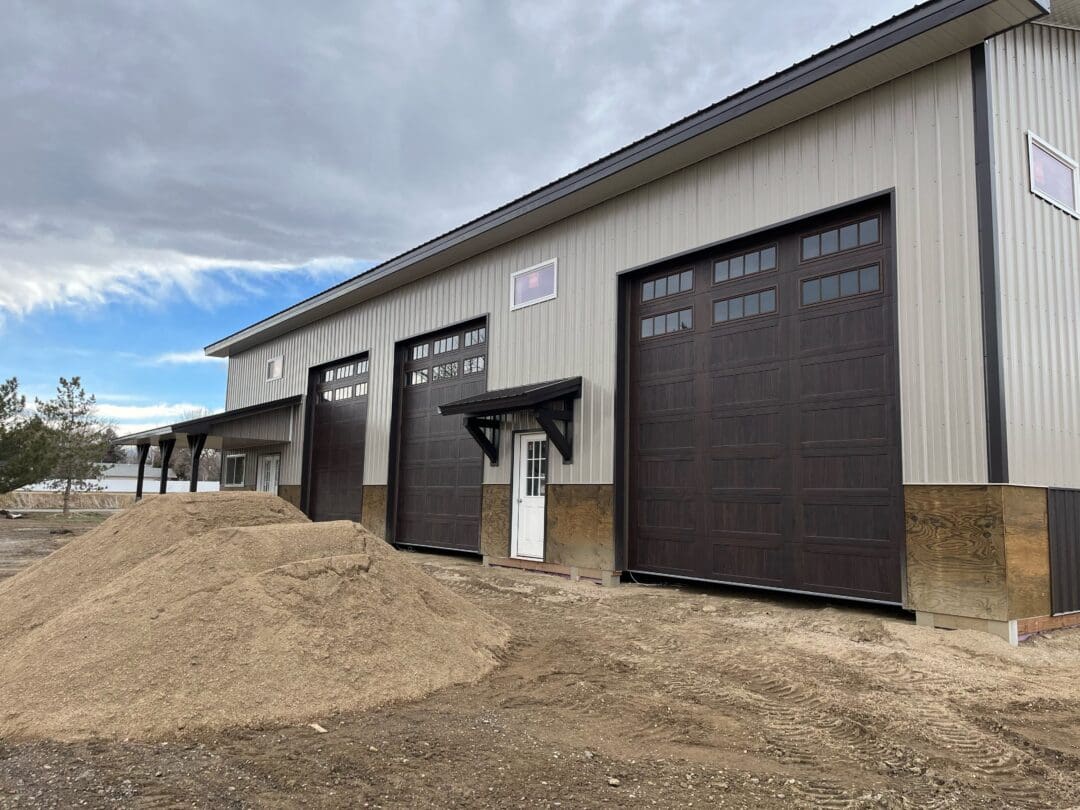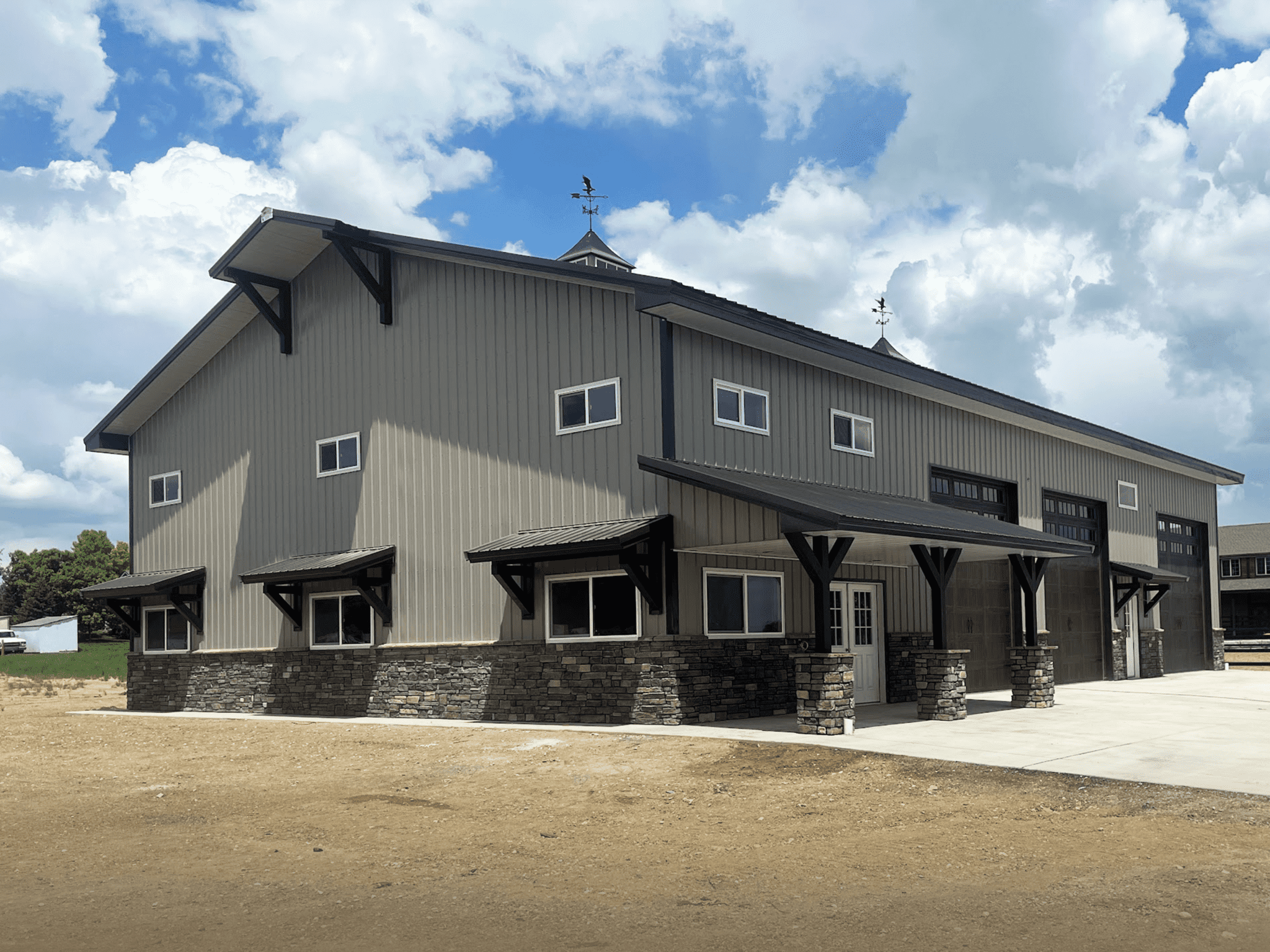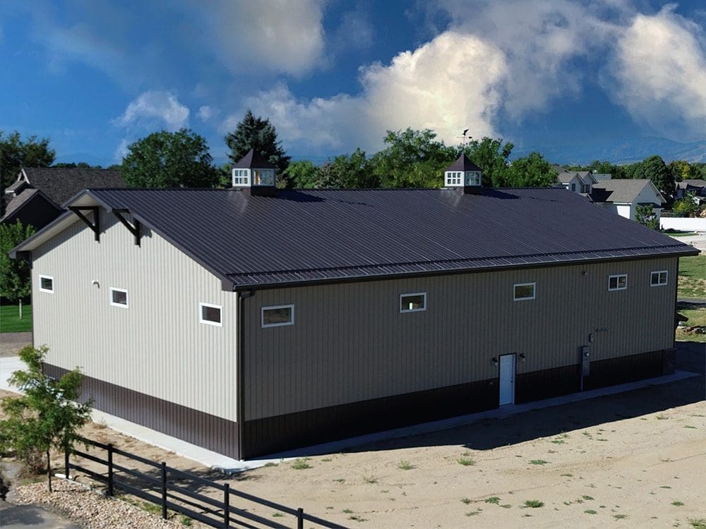 This pole barn shop is 50′ x 80′ x 18′. It features 8′ x 24′ 12′ open lean-to, (2) 12′ x 14′ and (1) 14′ x 14′ overhead garage doors, (4) eyebrows with corbels, (2) 48″ cupolas with eagles, (2) 12′ x 3′ gable extensions, (17) windows, 4′ stone wainscot with light stone siding and dark brown accent trim. Steel Structures America team in Colorado can transform your pole barn shop ideas into reality. Give us a call today, to find out how easy it is to get a pole barn metal shop building.