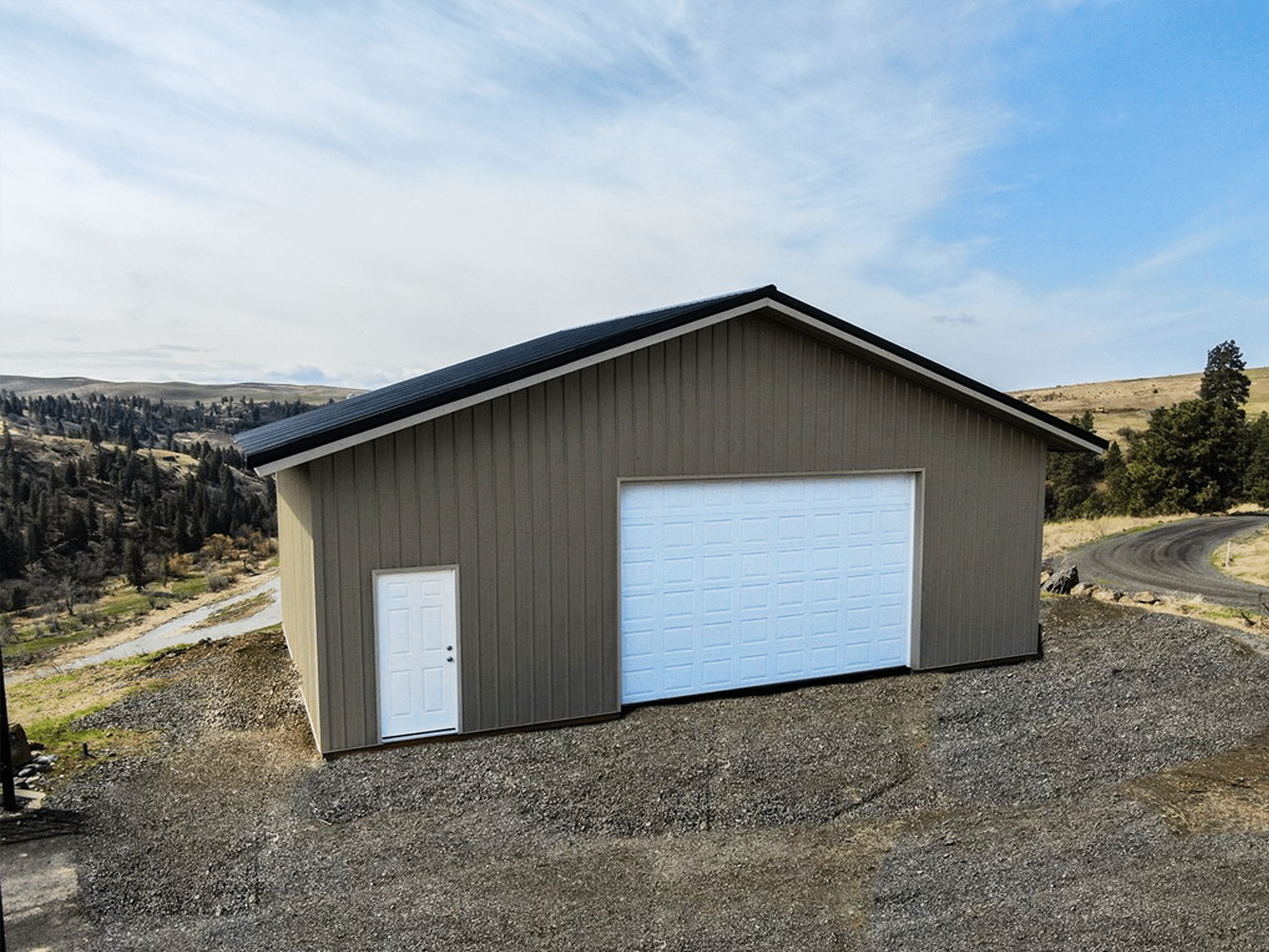 36′ x 24′ x 12′ garage featuring (1) 16′ x 10′ overhead door, man door and 24″ overhangs in sandstone with black accent trim.