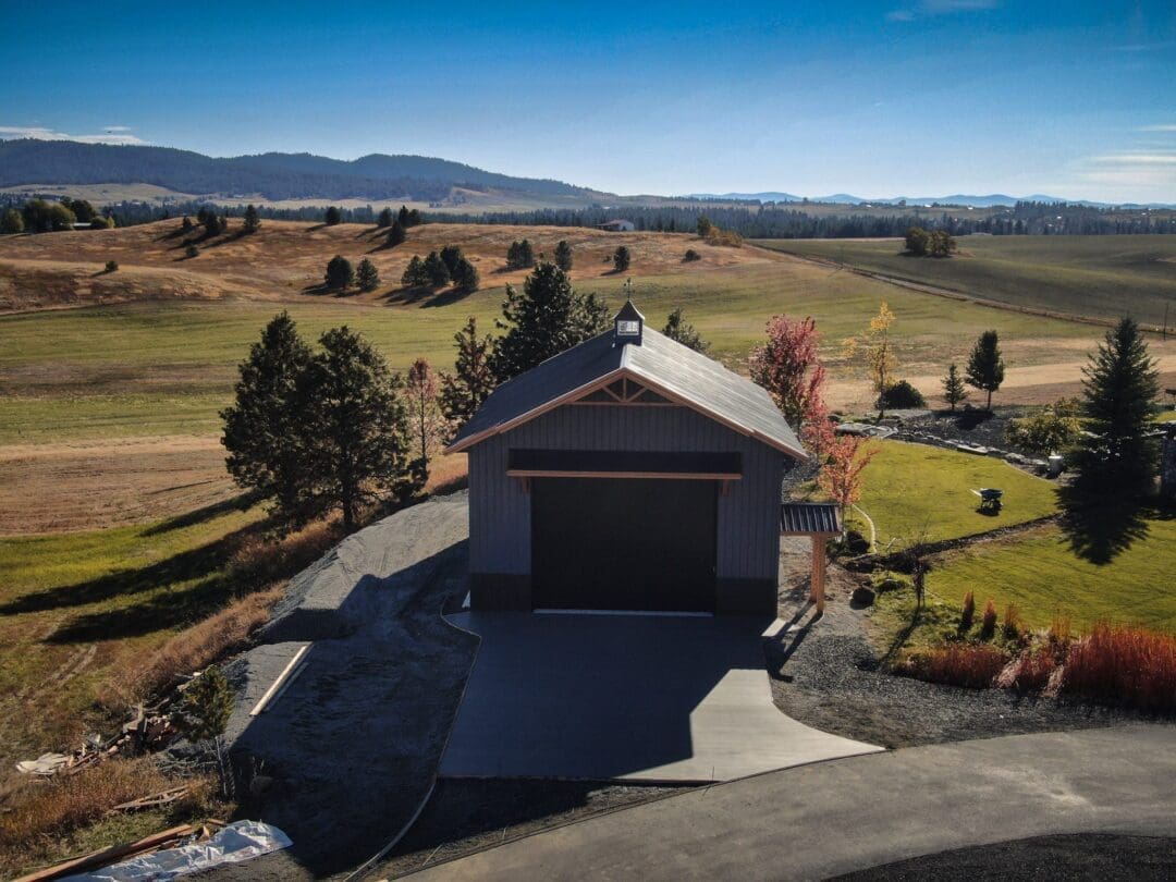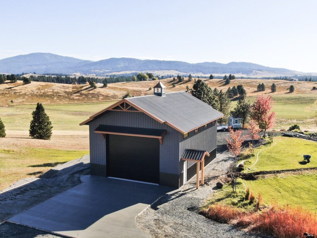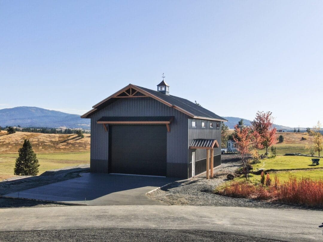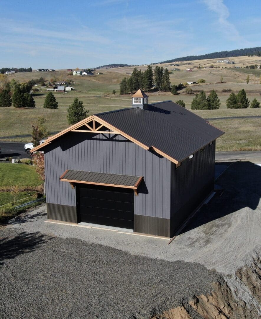 This is a standard Gable in Valleyford, WA done in stylish charcoal gray. This residential pole building features