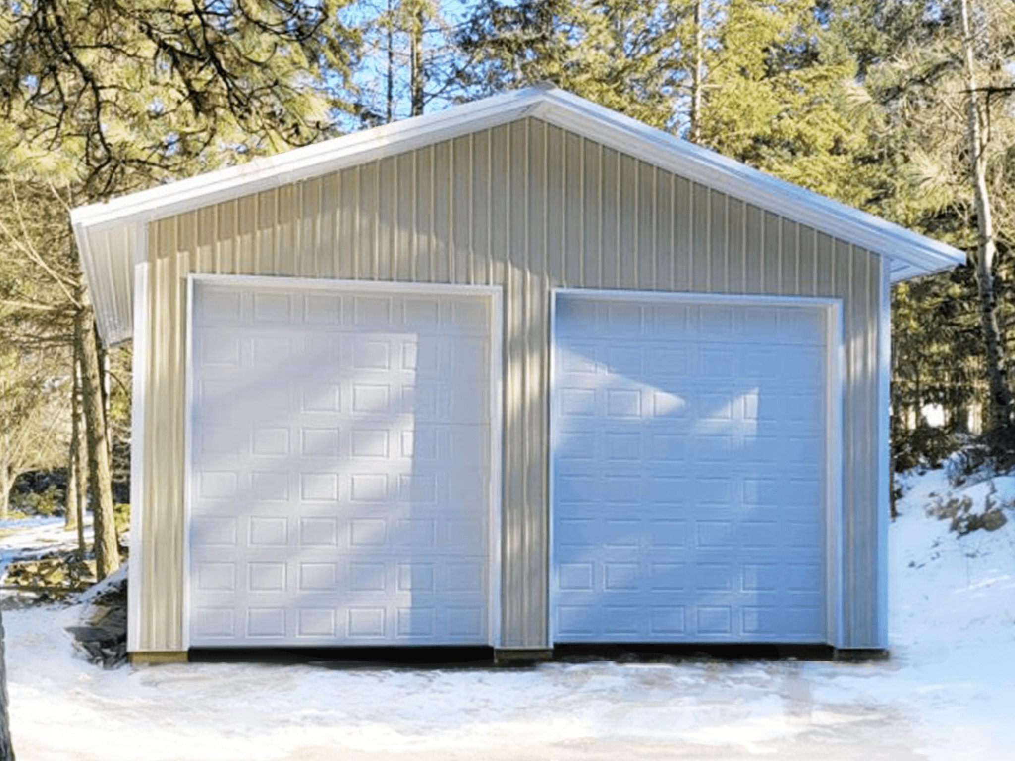 30′ x 40′ x 16′ garage featuring (2) 12′ x 14′ Therma Tech overhead doors, single man door and 24″ overhangs.