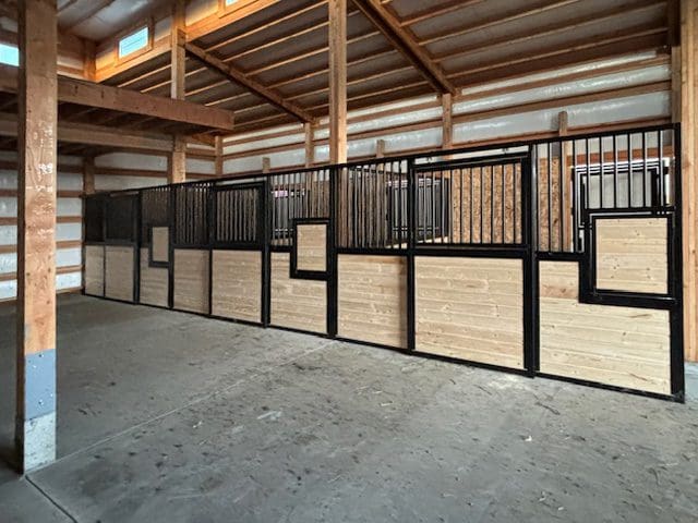 It has (1) 12′ x 12′ slide door and (1) 10′ x 8′Â steel overhead garage door. This facility includes stalls, store room and so much more.