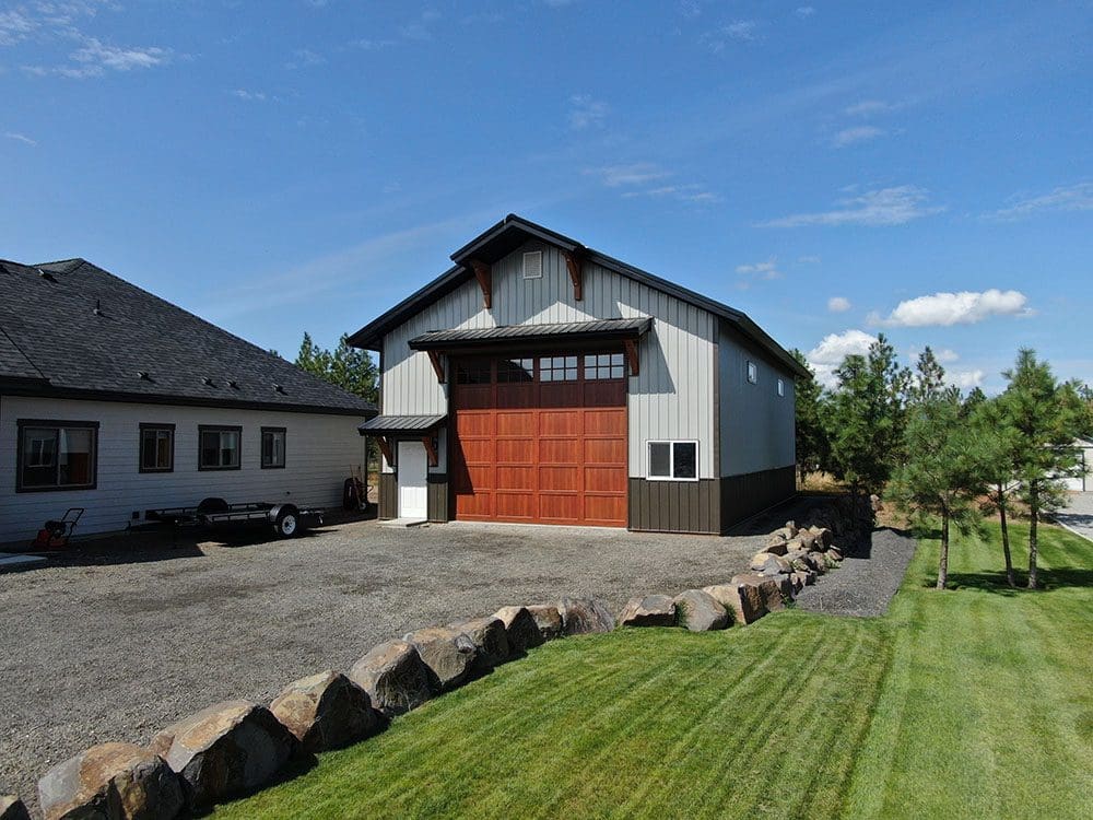 30′ x 50′ x 16′ garage featuring (1) 16′ x 14′ overhead door with canopy over garage and man door, 4′ x 10′ gable extension with corbels, (2) 4′ x 18″ fixed windows and (2) 4′ x 3′ windows in lightstone siding with weathered copper trim and wainscot.