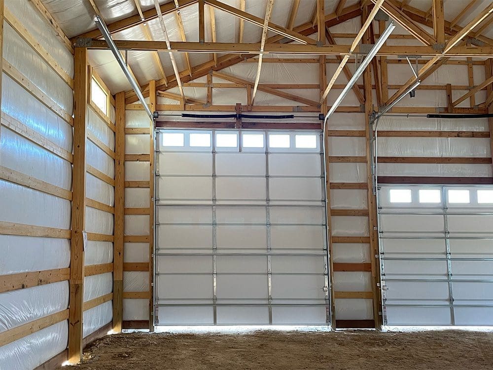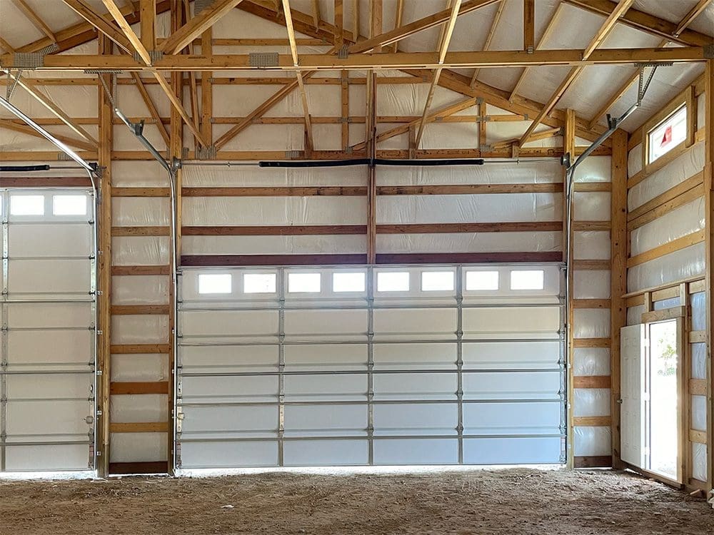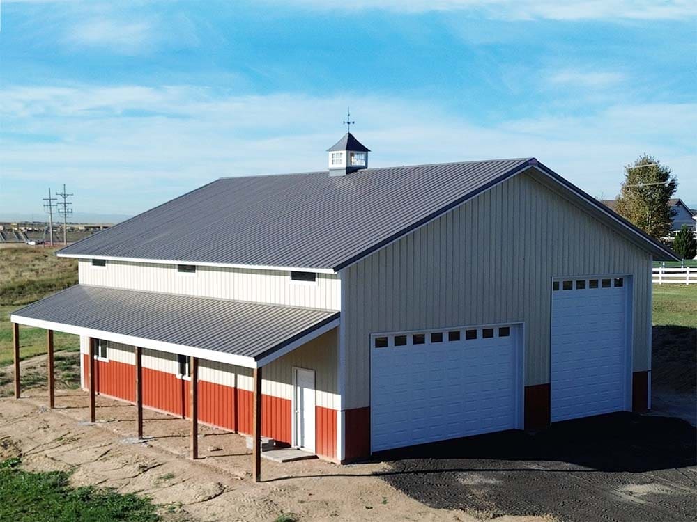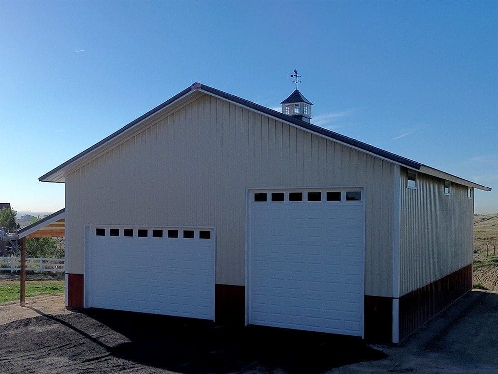 This 40′ x 50′ metal building in Brighton, CO, is finished in light stone siding, with white and charcoal accents, and a rustic red wainscot. The garage, measuring 40′ x 50′ x 16′, comes with an 8′ x 50′ x 12′ open lean-to, (1) 36″ cupola with windows and weathervane, and 2 overhead garage doors: one 12′ x 14′, and one 18′ x 9′.