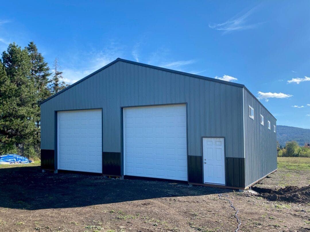 his custom 40′ x 48′ x 14′ garage was completed with an ash gray body and charcoal roof and wainscot, along with gray accents. This pole barn features (2) 12′ x 12′ overhead garage doors.