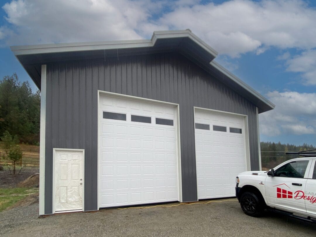 It is finished with a charcoal body and roof, with surf accents, corners, and soffits. This metal 36′ x 48′ work shop includes two 12′ x 14′ overhead steel doors.