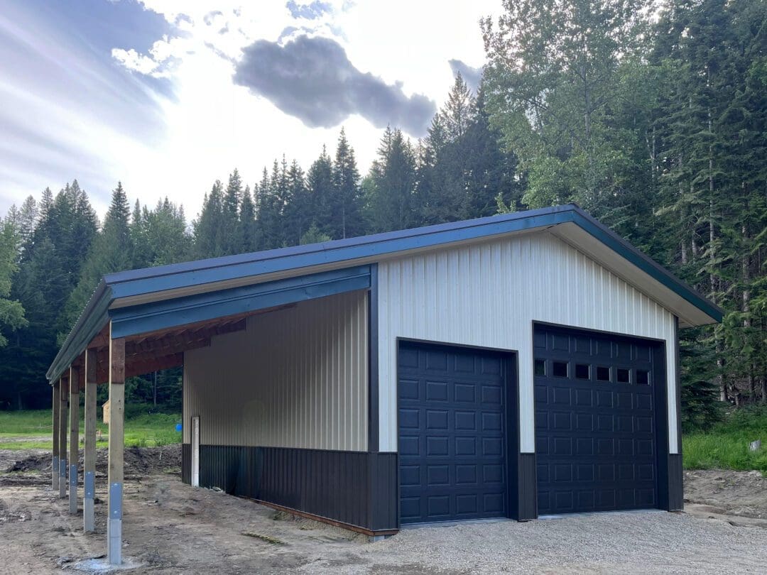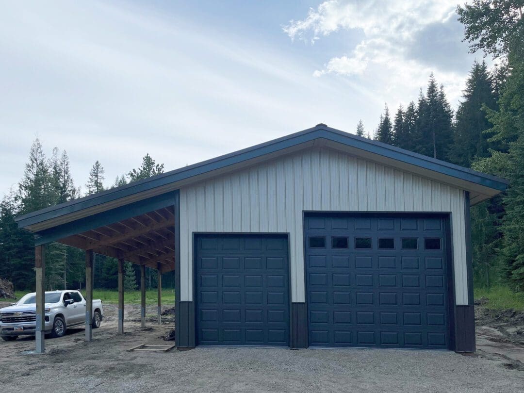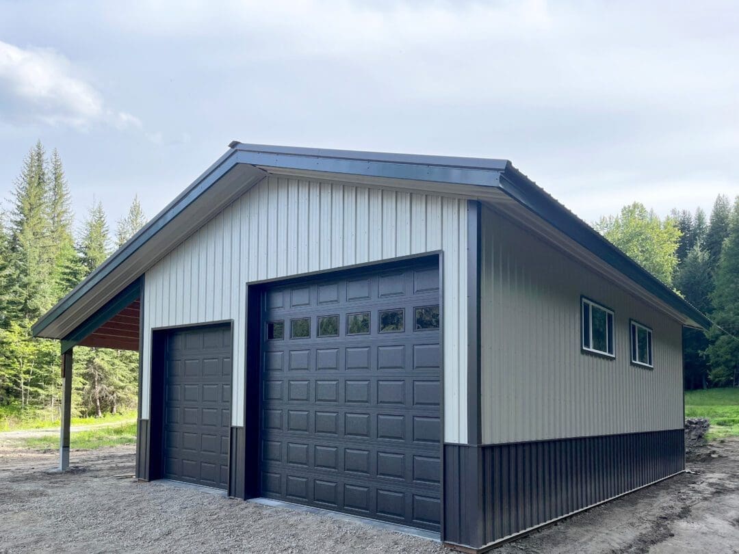 This metal garage was completed by our Idaho-Montana team. We design and engineer custom pole barns, garages, shops. Whether you are looking for a big scale project or a smaller metal pole barn, we got you covered. We have over 25 years of experience building metal garages, pole barns, and shops. This garage is 24′ x 40′ x 14′. It features (1) 12′ x 12′ and (1) 8′ x 10′ overhead steel garage doors. This metal shop was completed in light stone body with dark spruce roof, with weather copper corners, trim and body corners. This garage is an excellent example of how versatile and practical even the smallest pole barns can be. Steel Structures America specializes in highly customizable pole barns; we can make any garage, shop, or barn dream a reality. Contact us today