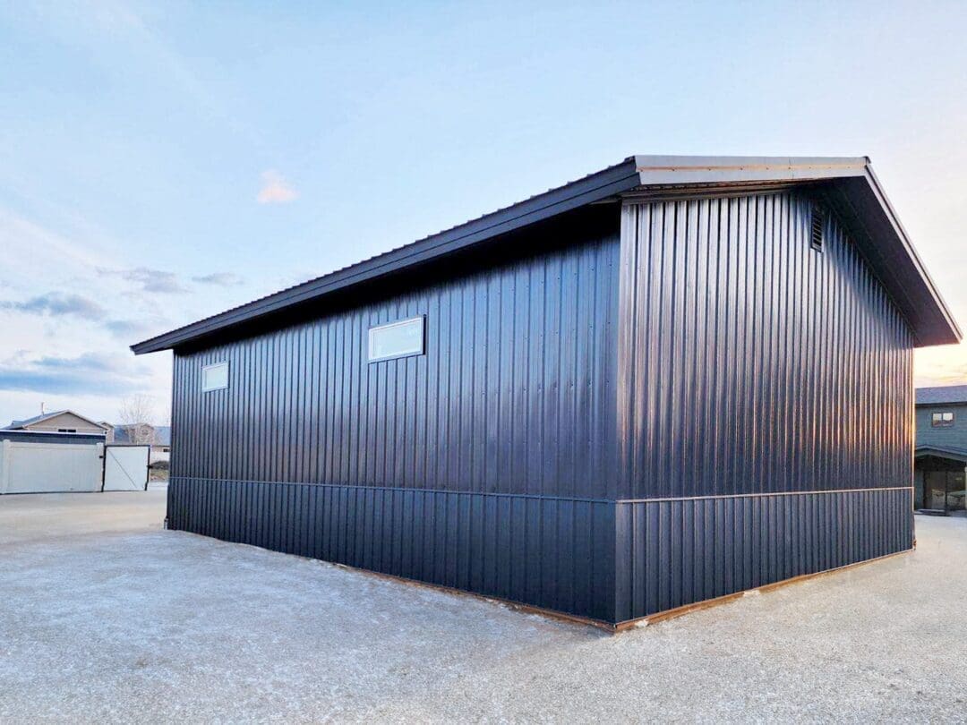This pole building is 30′ x 40′ x 14′ garage and shop located in Idaho. This pole barn is completed with body and black crinkle roof, accents, corners, wainscot, and soffits. Additionally, this pole building comes with (2) garage doors (1) 16′ x 12′ and (1) 8′ x 8′ overhead steel garage doors.