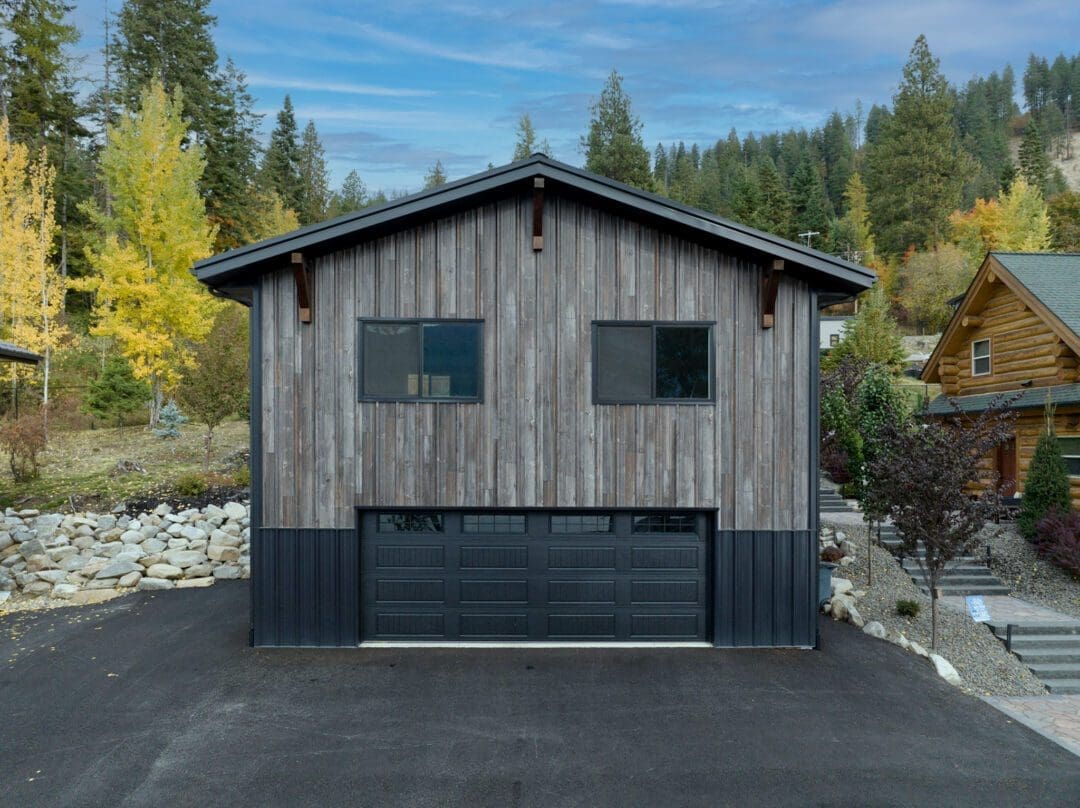 This beautiful 28′ x 28′ workshop in Bayview, ID, is the perfect addition to any home for storage or work space. This pole barn structure has one 18′ x 7′ overhead garage door. This building was completed in metal siding that looks like barnwood (exclusively available at our sister company Metal America) and features unique 6′ black wainscot, black roof, soffits, and corners.