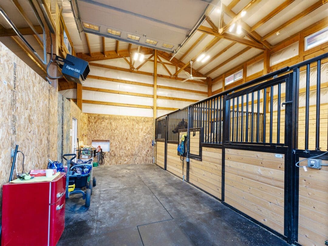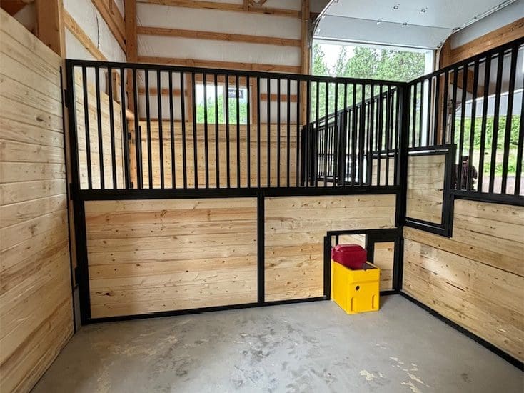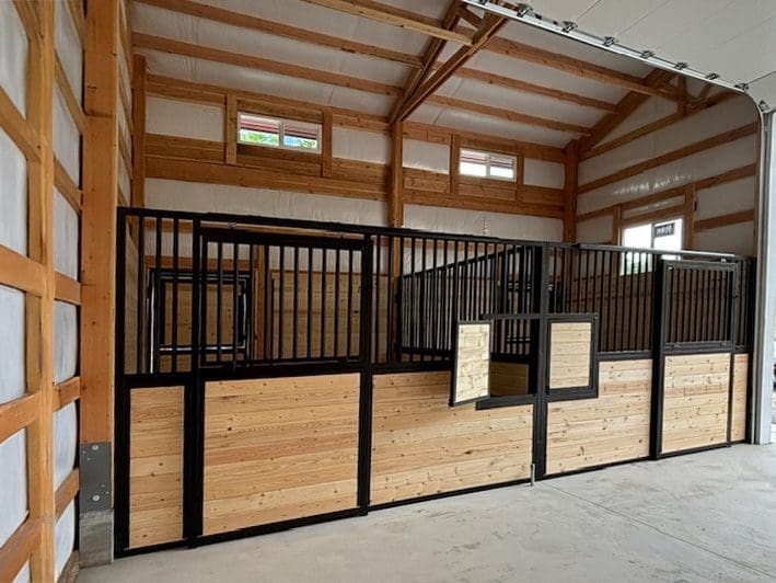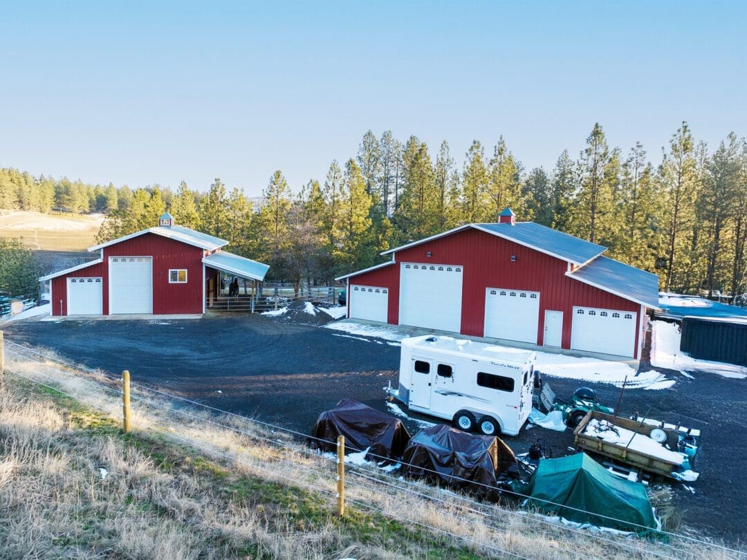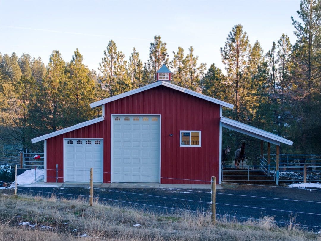 This beautiful horse barn in Spokane, WA, was completed by our Eastern Washington pole building team. It is 24′ x 24′ x 16′ gable style building with (1) 12′ x 24′ x 10′ open lean-to and (1) 12′ x 24′ x 10′ enclosed lean-to. This barn features horse stalls, and hay storage and includes (1) 10′ x 14′ and (1) 8′ x 9′ Therma-Tech overhead steel garage doors. It was completed using our newest color selection of metal manufactured in Post Falls, ID at Metal America.Â
