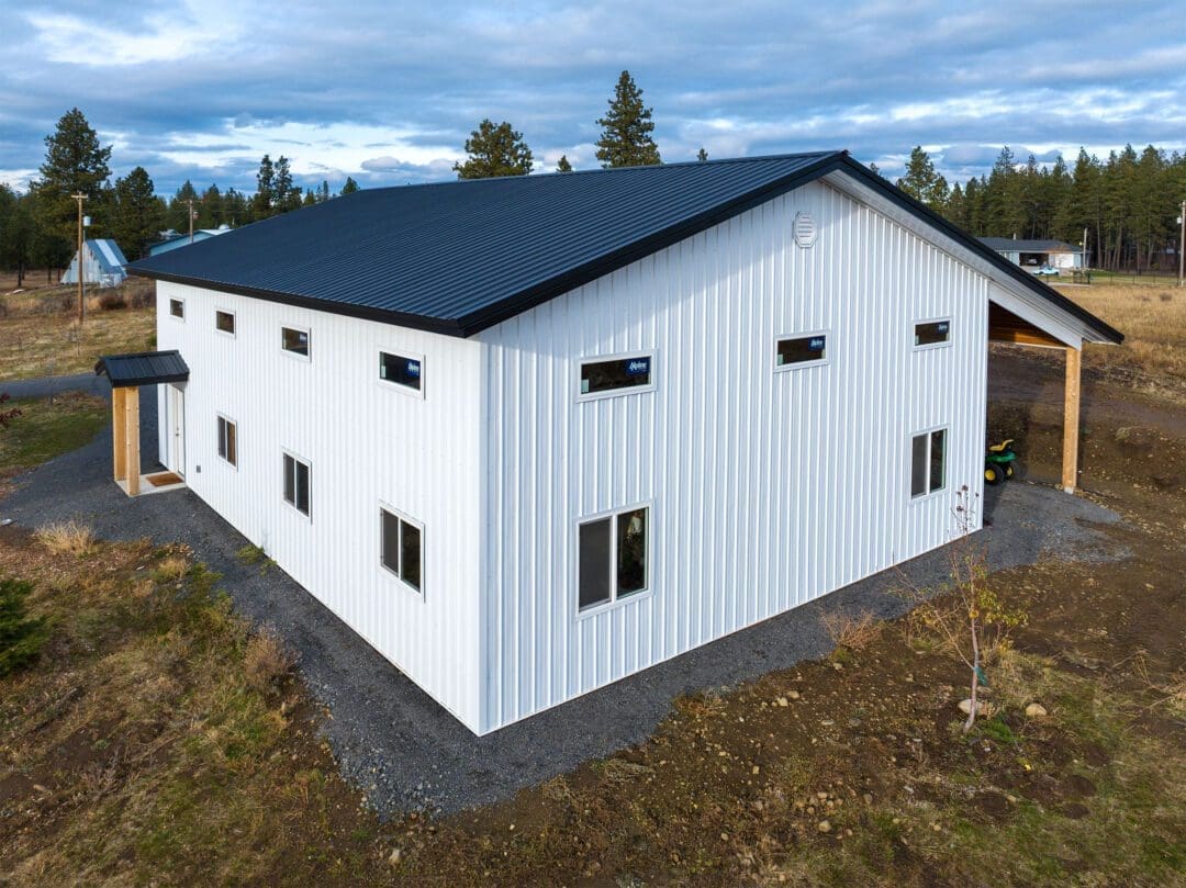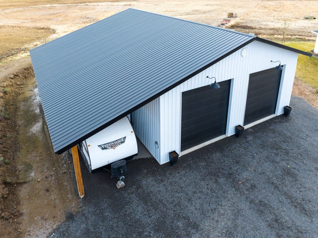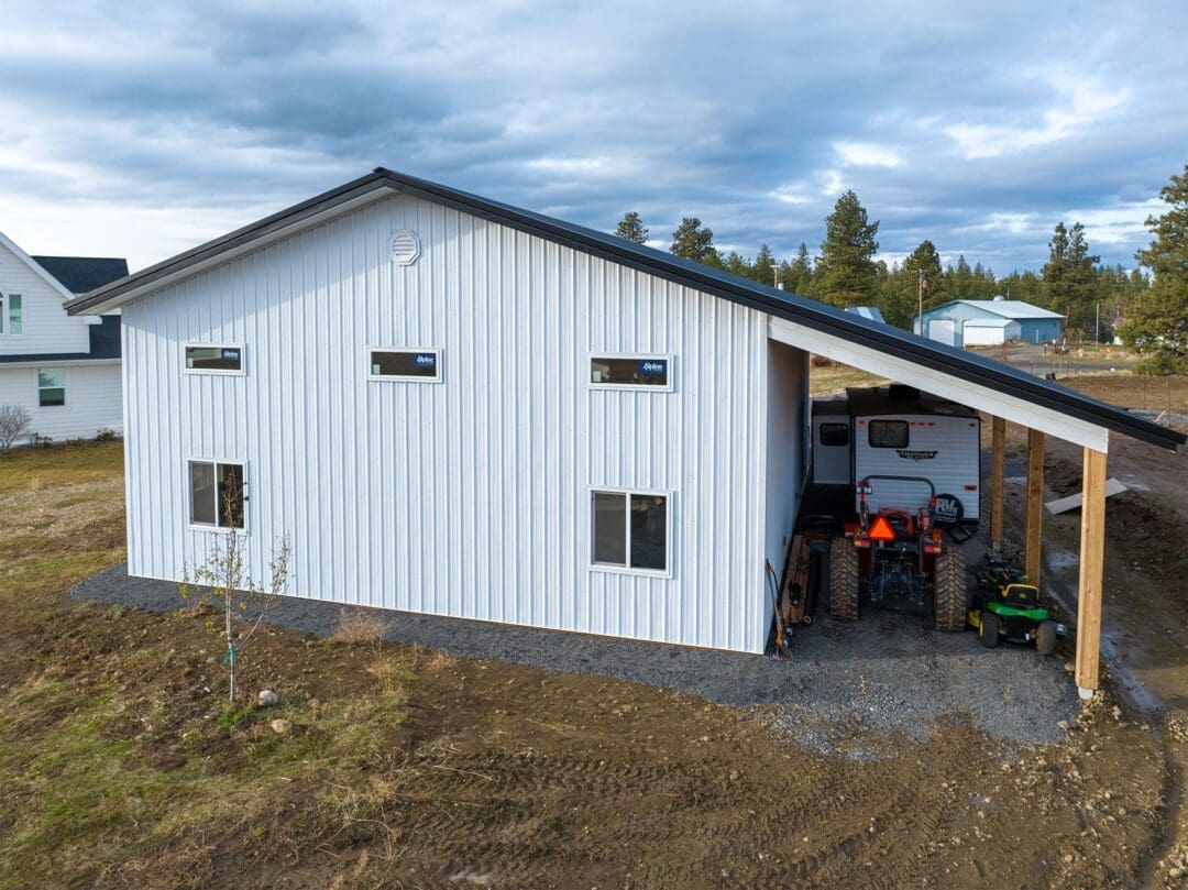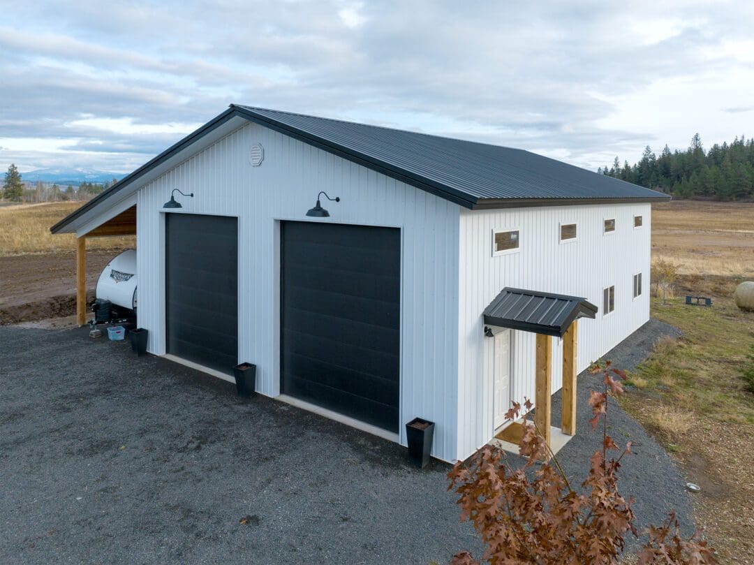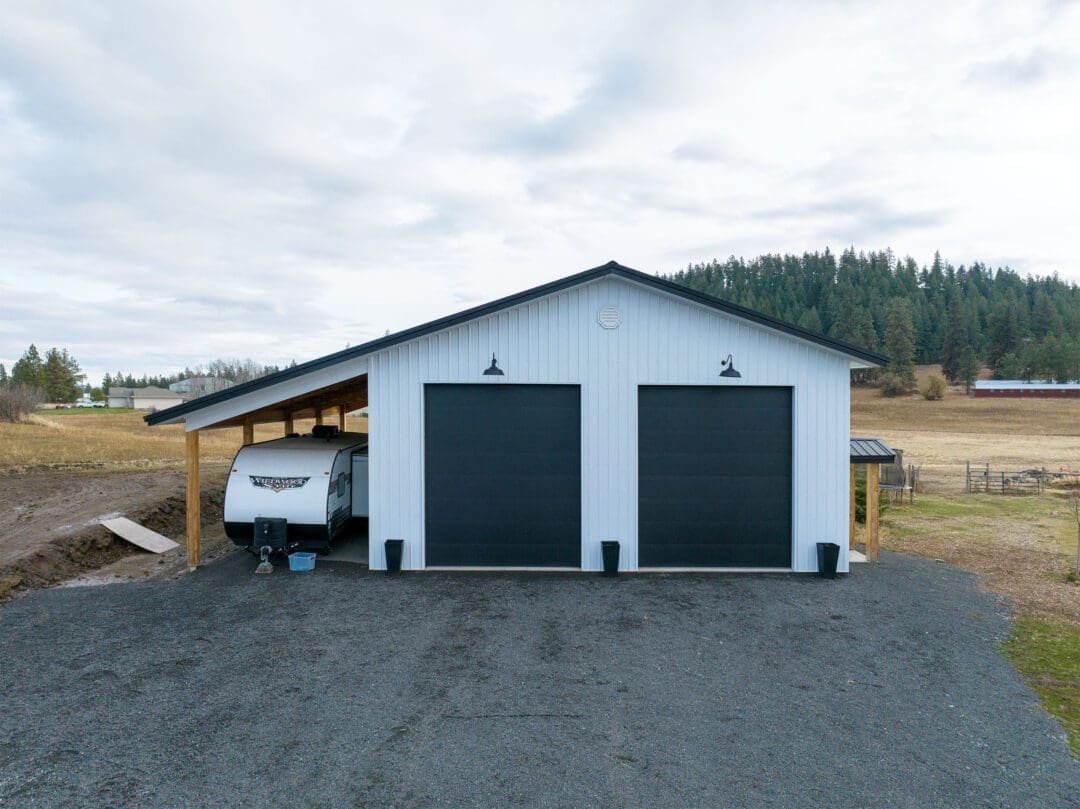 This beautiful and modern metal garage pole barn was completed by our Eastern Washington build crews. Featuring ample interior space and a lean-to, this build is perfect for multi-use and winter storage of summer toys, like RVs or boats. The modern color choice of white and black compliments any existing buildings. The steel panels are provided by our sister company in Post Falls, ID at Metal America.Â