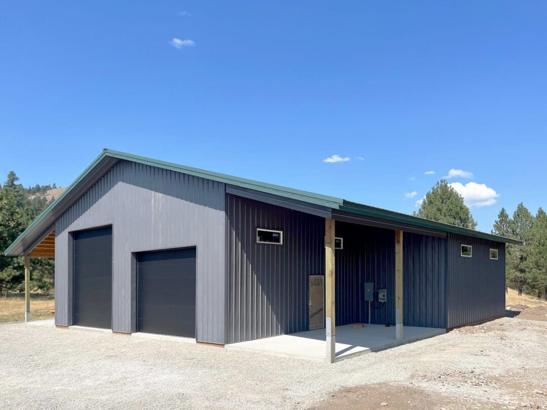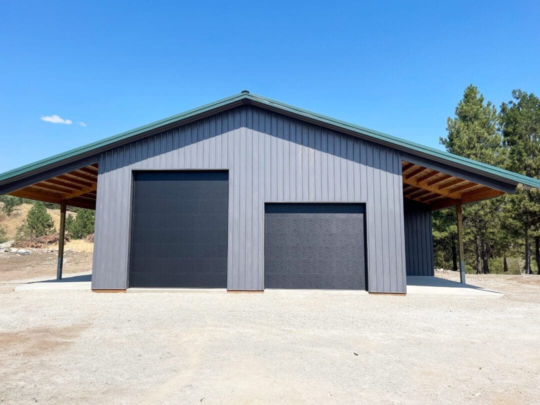 This metal workshop was completed by our Eastern Washington team. Featuring one fully open lean-to and one partially enclosed lean-to, this shop style offers space for all your needs. This build includes two overhead doors in different sizes to allow the space to be multi-purpose.