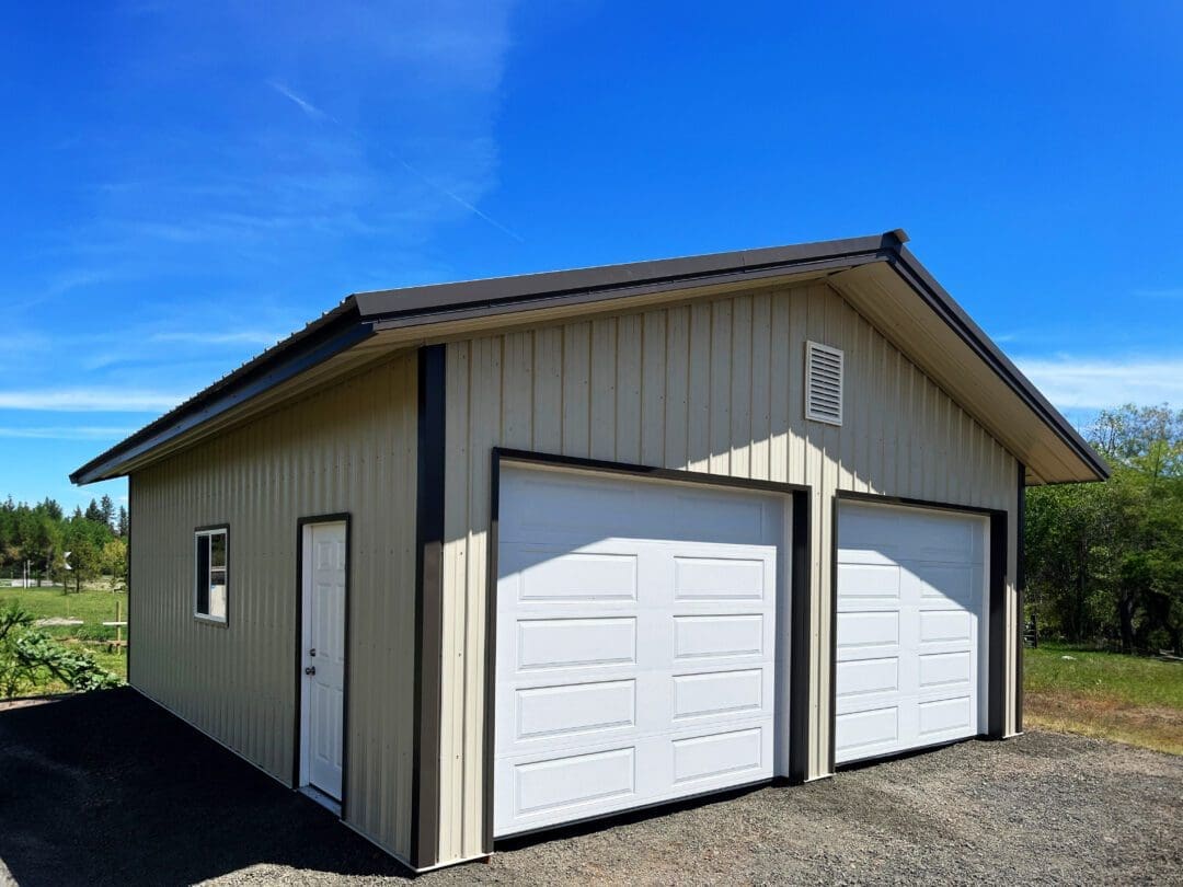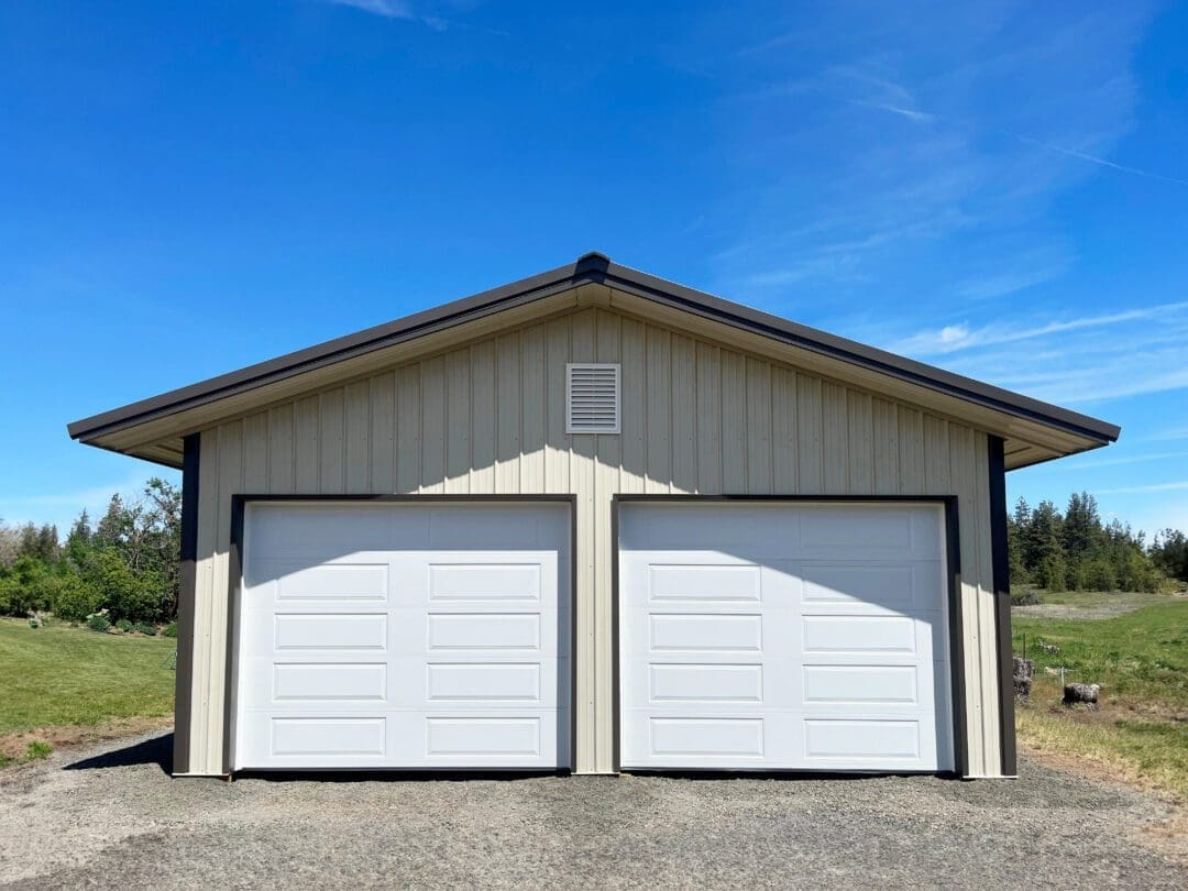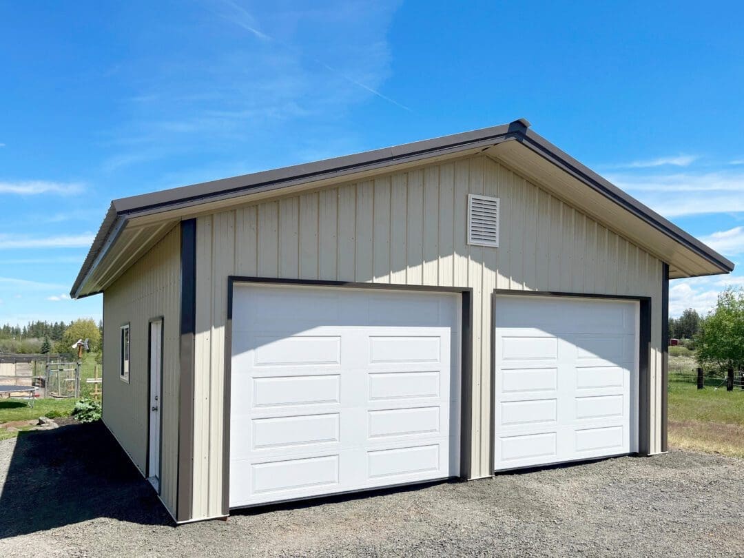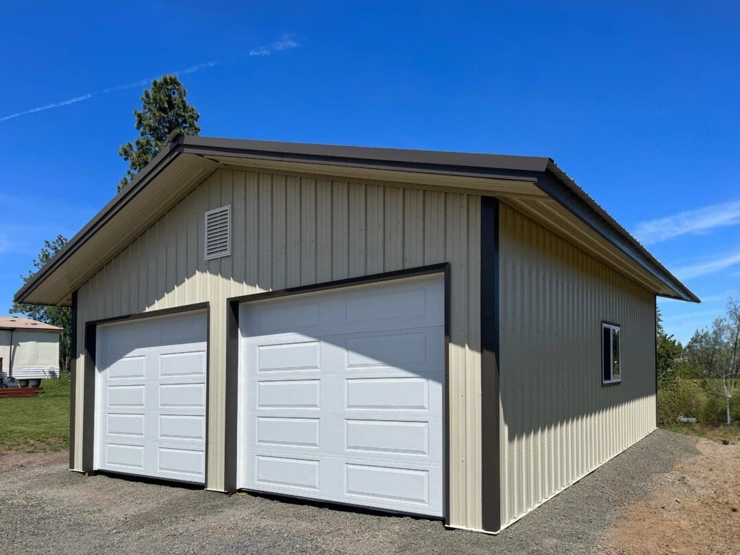 This pole barn garage is 24′ x 30′ x 10′ features (2) 10′ x 8′ overhead steel garage doors. This garage was completed in light stone body and burnished slate roof and corners and trim. It stands as a prime example of our smaller, very customizable metal storage buildings, pole barn garages and sheds. With over 25 years of experience in designing and engineering metal garages, custom pole barns across the western United States, we can make any pole barn dreams a reality. Contact us today