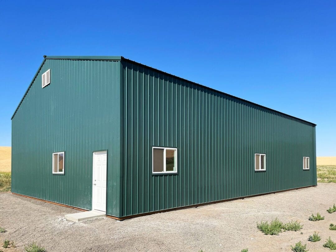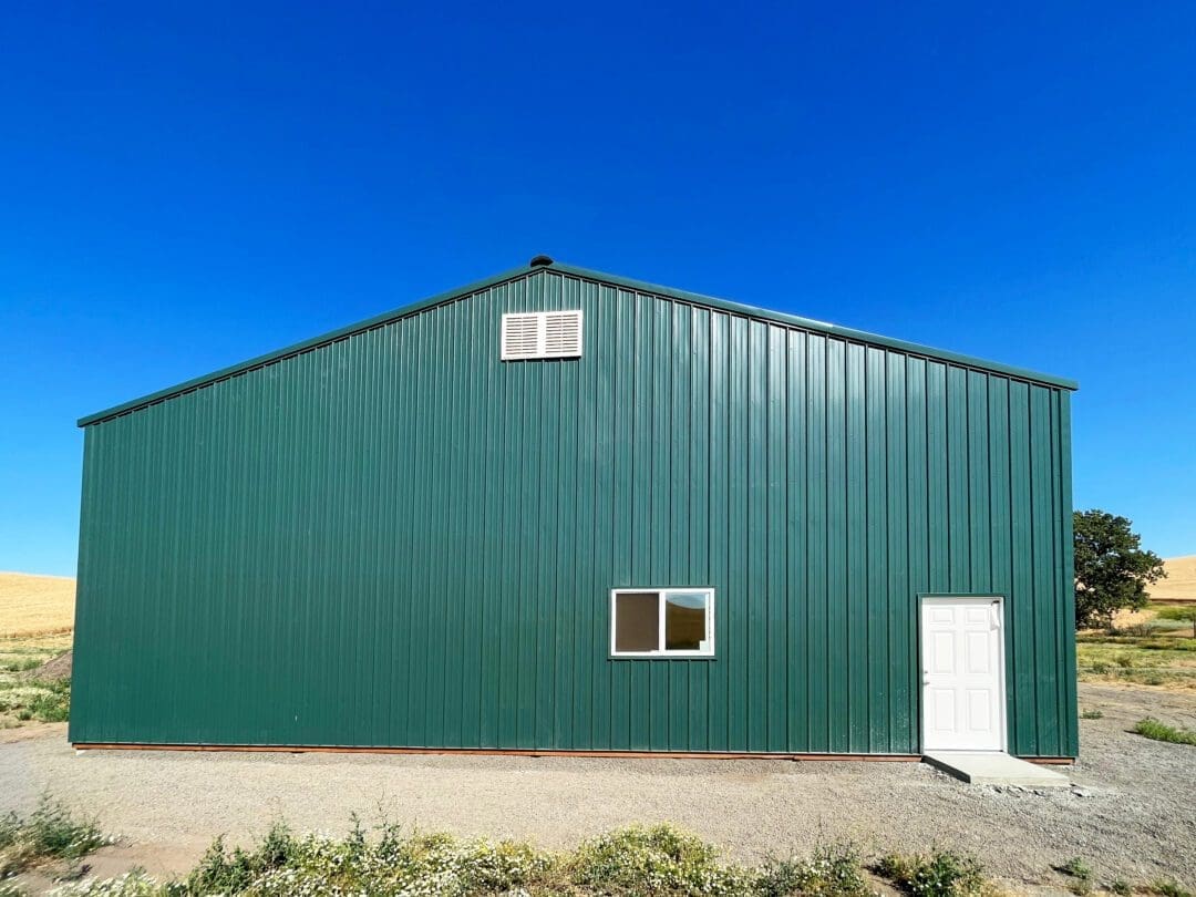 The color selection for this farm shop is ivy green body, body corners, roof and door trim. Steel Structures America has over 25 years of metal pole barn construction.