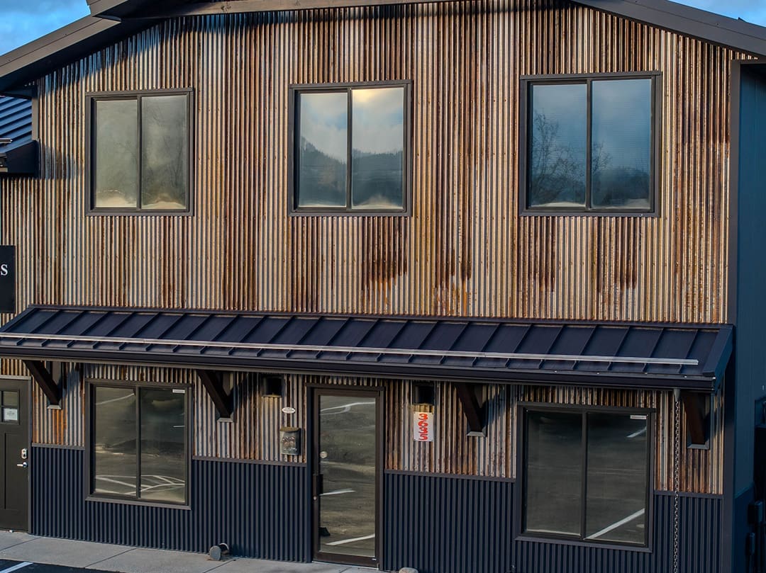 | Colors | Cor-Ten® siding on main office, Vintage Evolution siding on shop wall, Gun Metal roofing and accents |