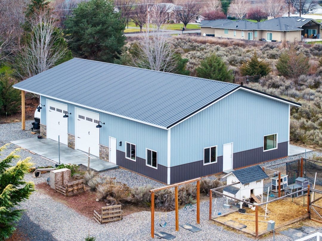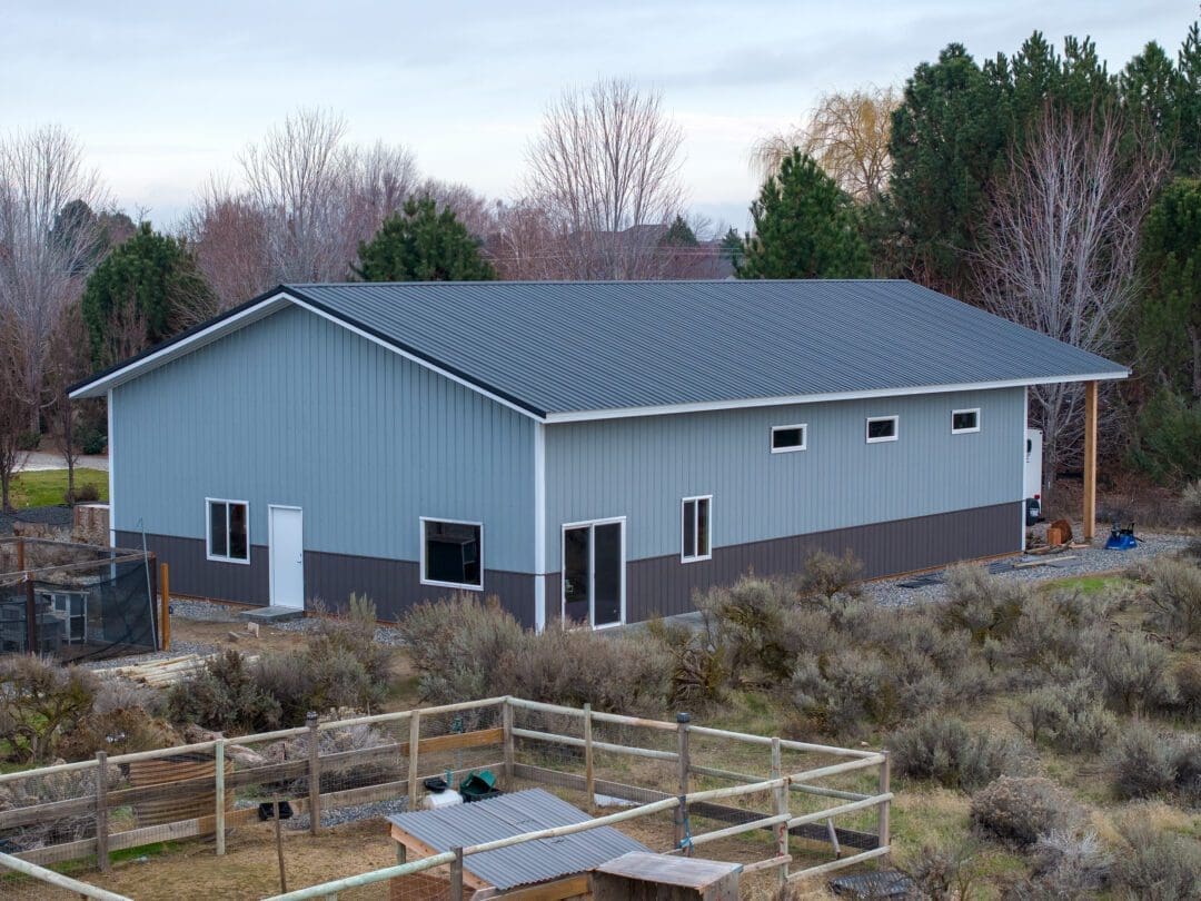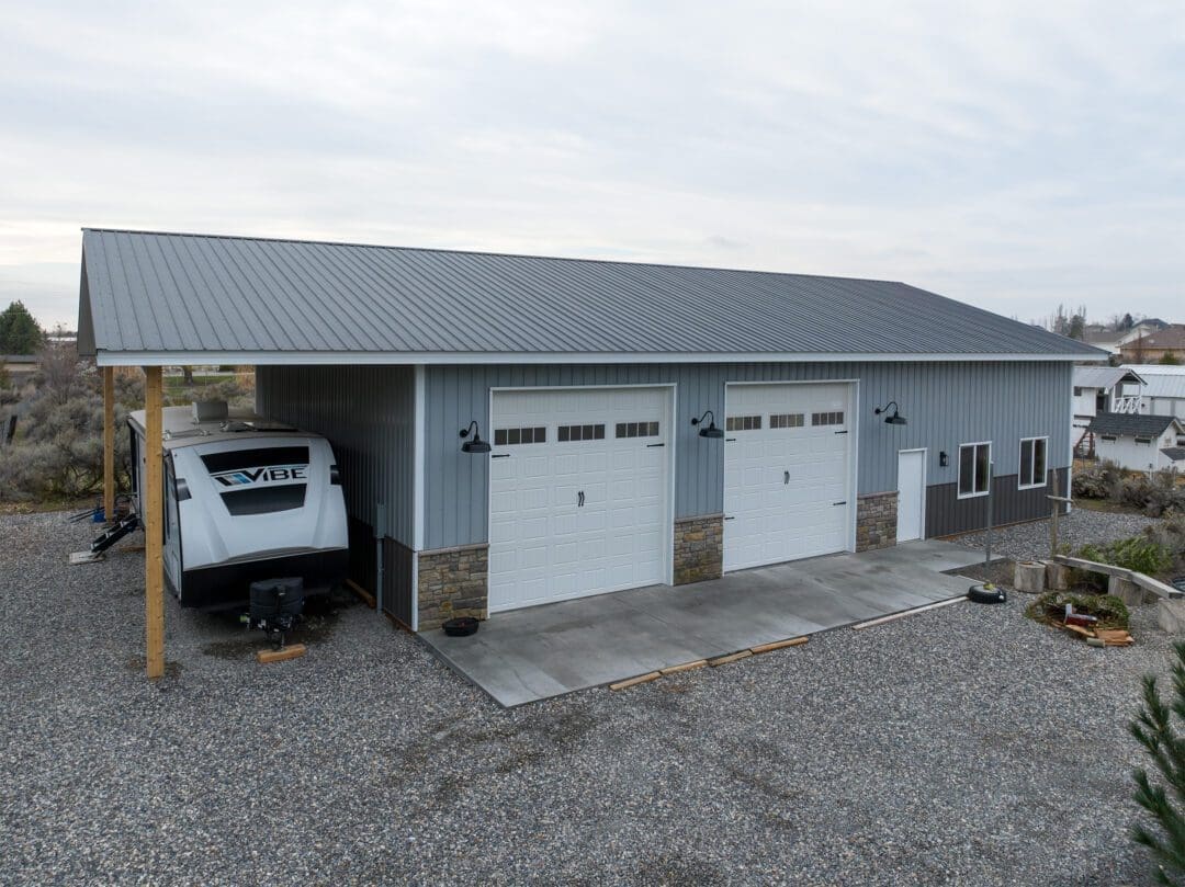 This 40′ x 60′ metal shop with RV storage was built by our Central Washington team in West Richland, WA. It offers 2400 sqft of enclosed space for dry storage, with an additional 480 sqft of open space to store summer toys during the off-season.