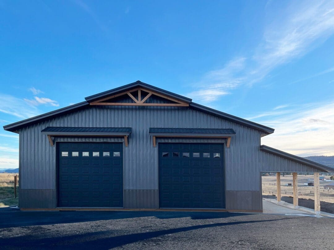 This beautiful 50′ x 80′ x 16′ shop is one of the many metal buildings our North Idaho & Montana team built in 2024. It features a small 12′ x 20′ x 14′ lean-to. This pole barn shop has one 14′ x 14′ overhead painted garage doors. This body is charcoal metal, while the roof, roof corners, door trim, soffits and 4′ wainscot are burnished slate from Metal America. The snow load for this build is 65lbs, making it perfect for Montana winters.