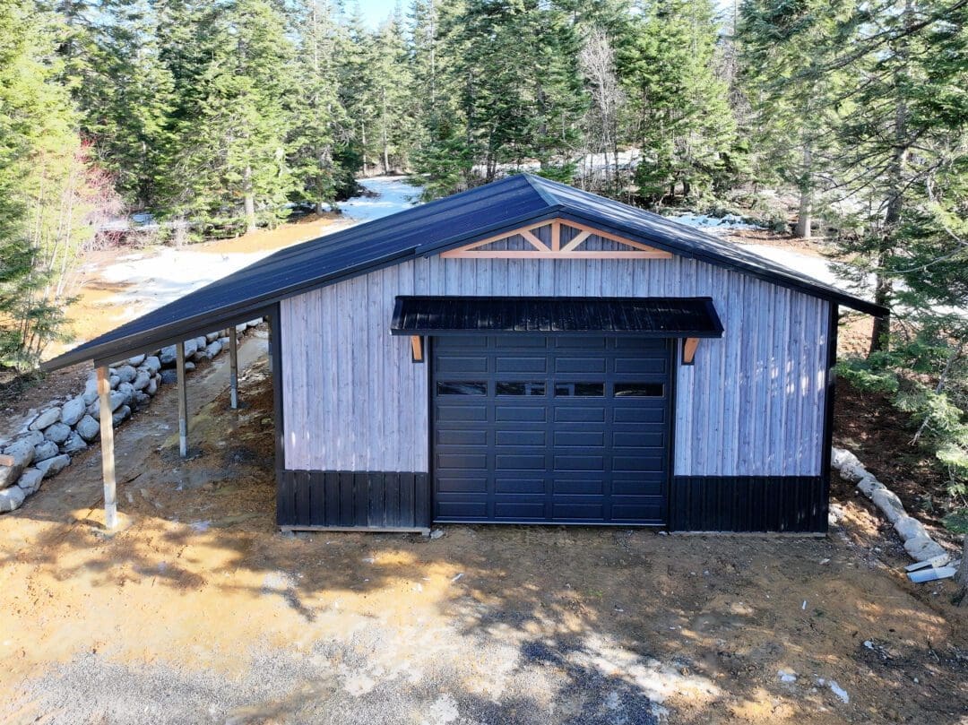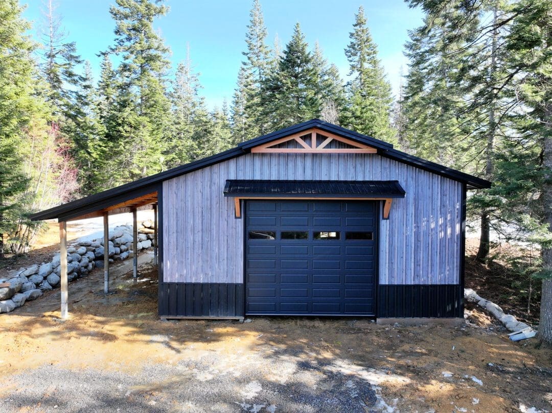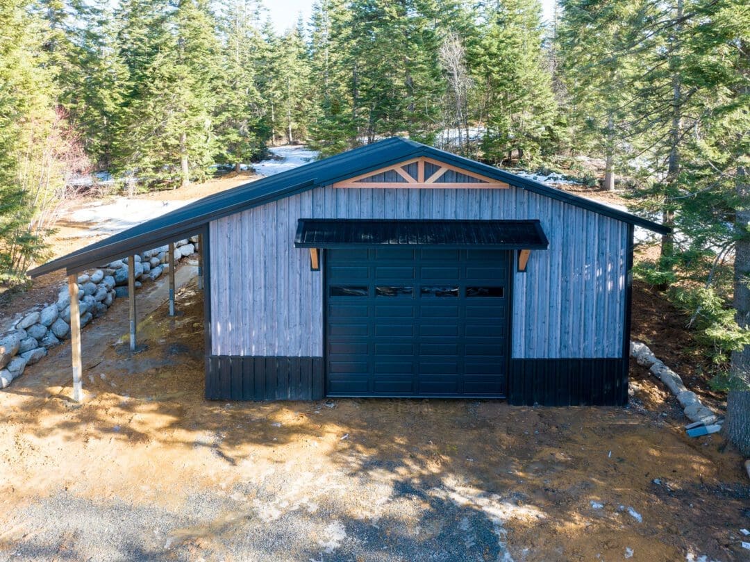 The side and end wall panels feature Metal America’s Rough Cedar Gray, paired with a Black Crinkle Finish wainscot that adds bold contrast and depth. The roof, soffit, fascia, and trim are finished in Ultra Low Gloss Black, offering a clean, matte aesthetic that complements the gray tones. A few accent trim pieces also feature Black Crinkle Finish, tying the entire look together.