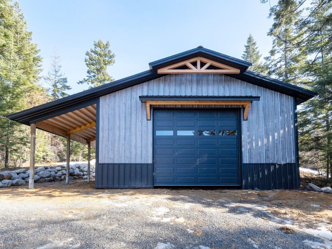 This stunning Rough Cedar Gray workshop measures 36′ x 48′ x 16′, featuring a 12′ x 48′ x 11′ lean-to for added covered space.