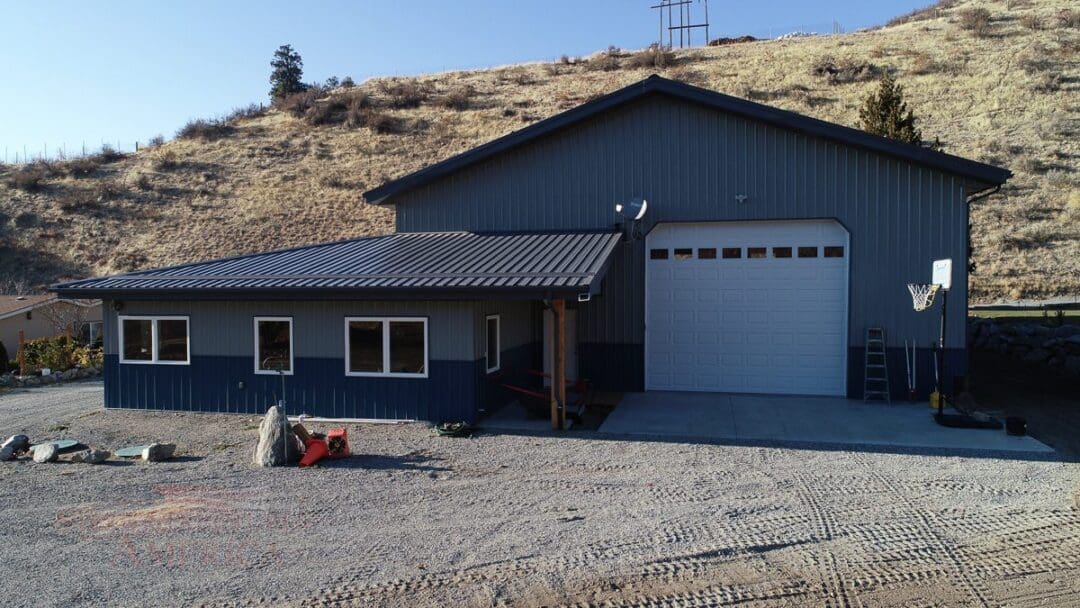This 40′ x 60′ x 16′ small barndominium in Chelan, Washington features 12′ covered lean-to porch, 2 16′ overhead garage doors.