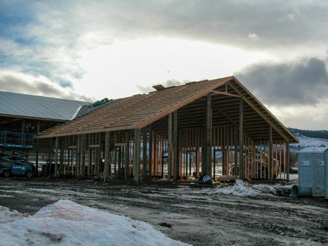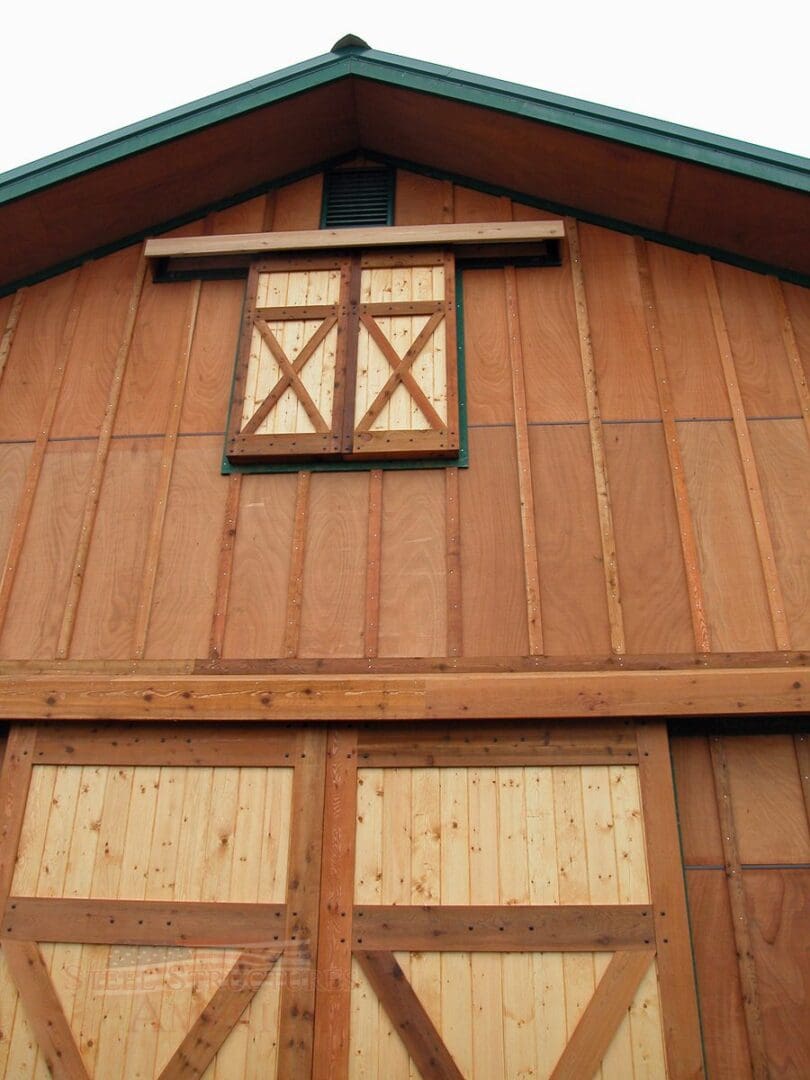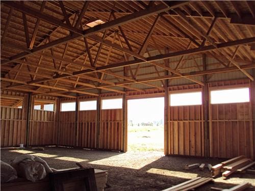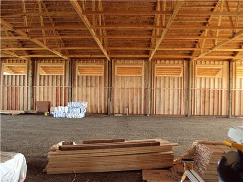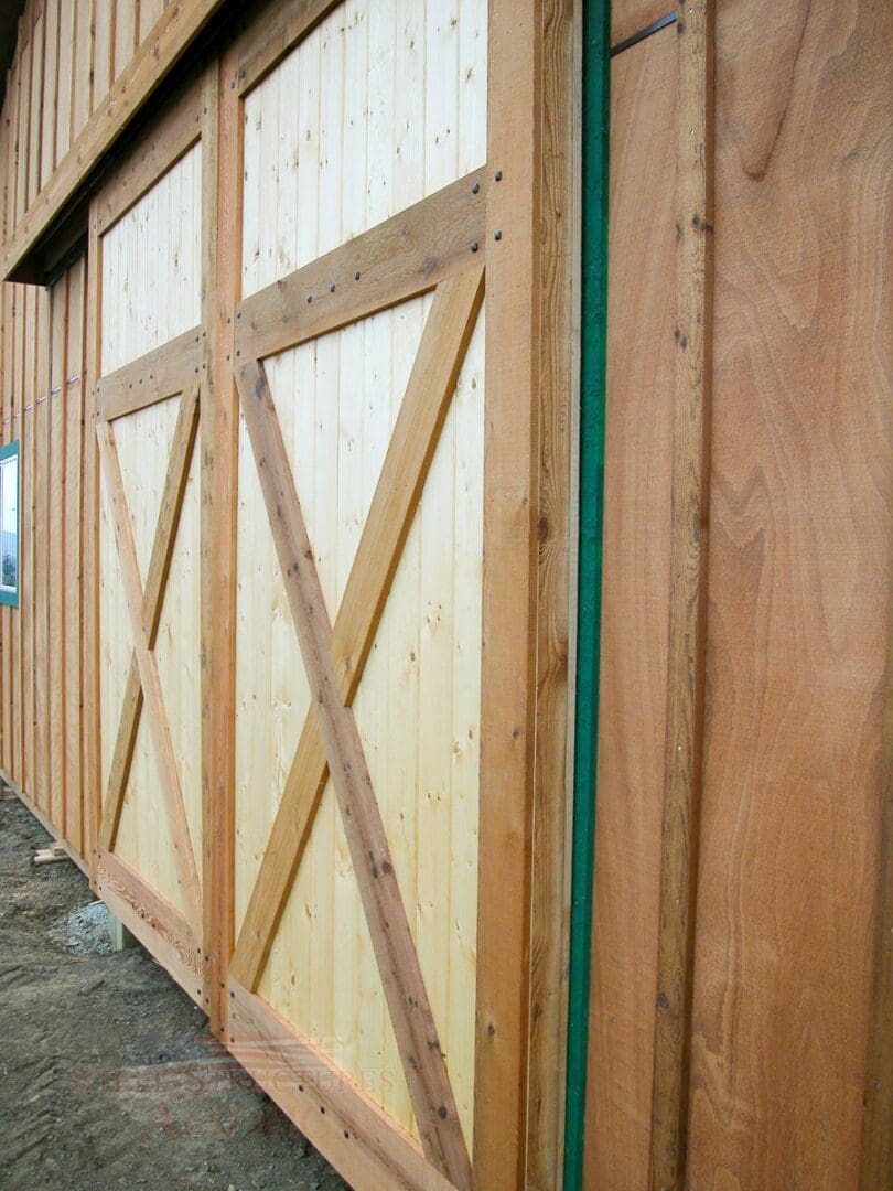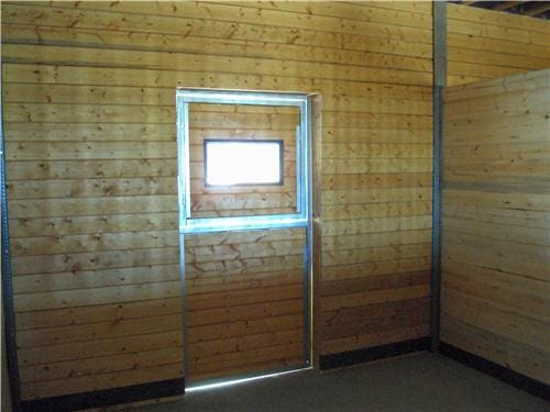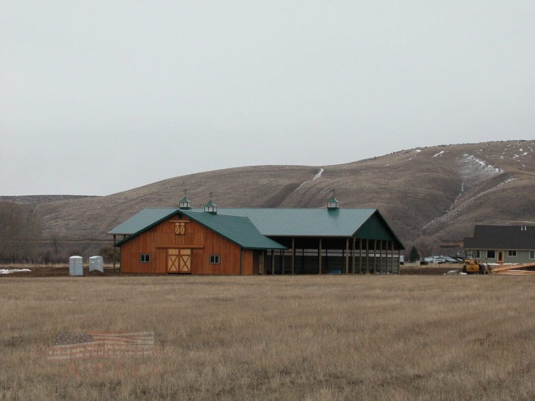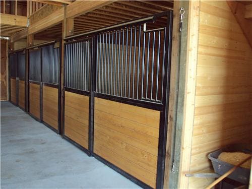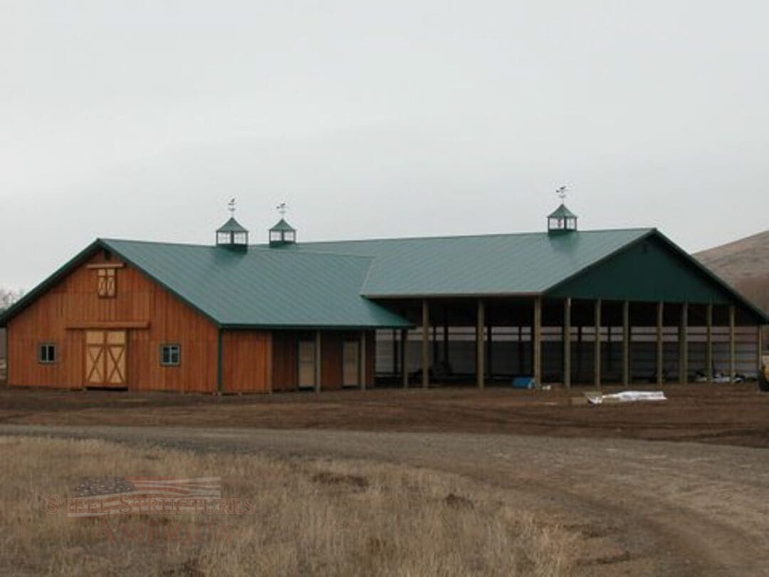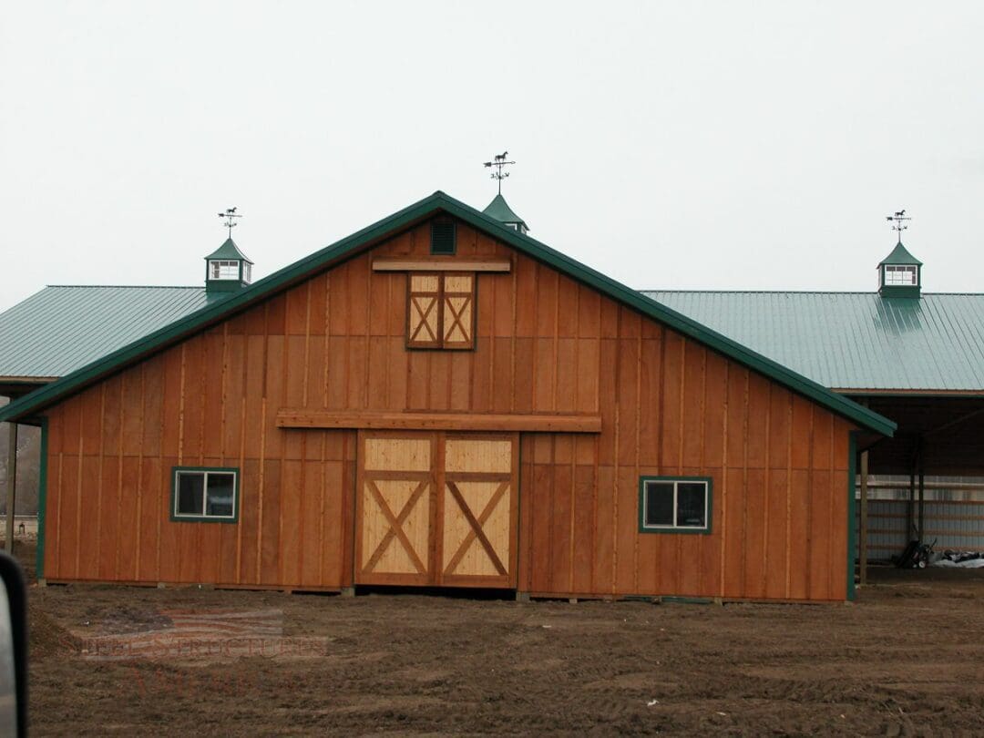 A horse lover’s dream building. The riding arena is 70’x108’x16′ and the barn is 52’x48’x14′. The siding is stained cedar board and battens. All sliding doors are custom built with a crossbuck design. There are (6) 12×12 stalls powder coated black and lined with 2×6 T&G. The roof features 2′ overhangs and (3) 48″ cupolas.