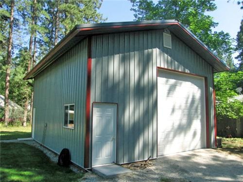 This is a typical pole building garage including a man door and one garage door. The building also features 2′ roof overhangs on all sides.