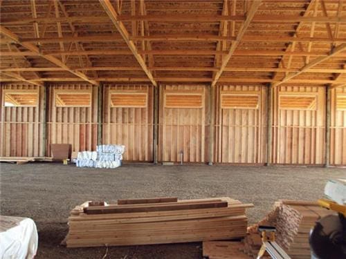A vertical stud wall can be used in conjunction with or in lieu of standard wall girts to support other horizontal siding options. The vertical stud wall is similar to stick frame construction. 2×6 or 2×4 studs are placed vertical 24” or 16” on center between the posts. This creates a cavity for R-19 insulation and provides the necessary area on the stud to fasten drywall. The vertical stud wall has its advantages when mounting objects such as shelving or cabinets to a wall where maximum strength is desired. This framing option is used when a fully finished room or building is desired.